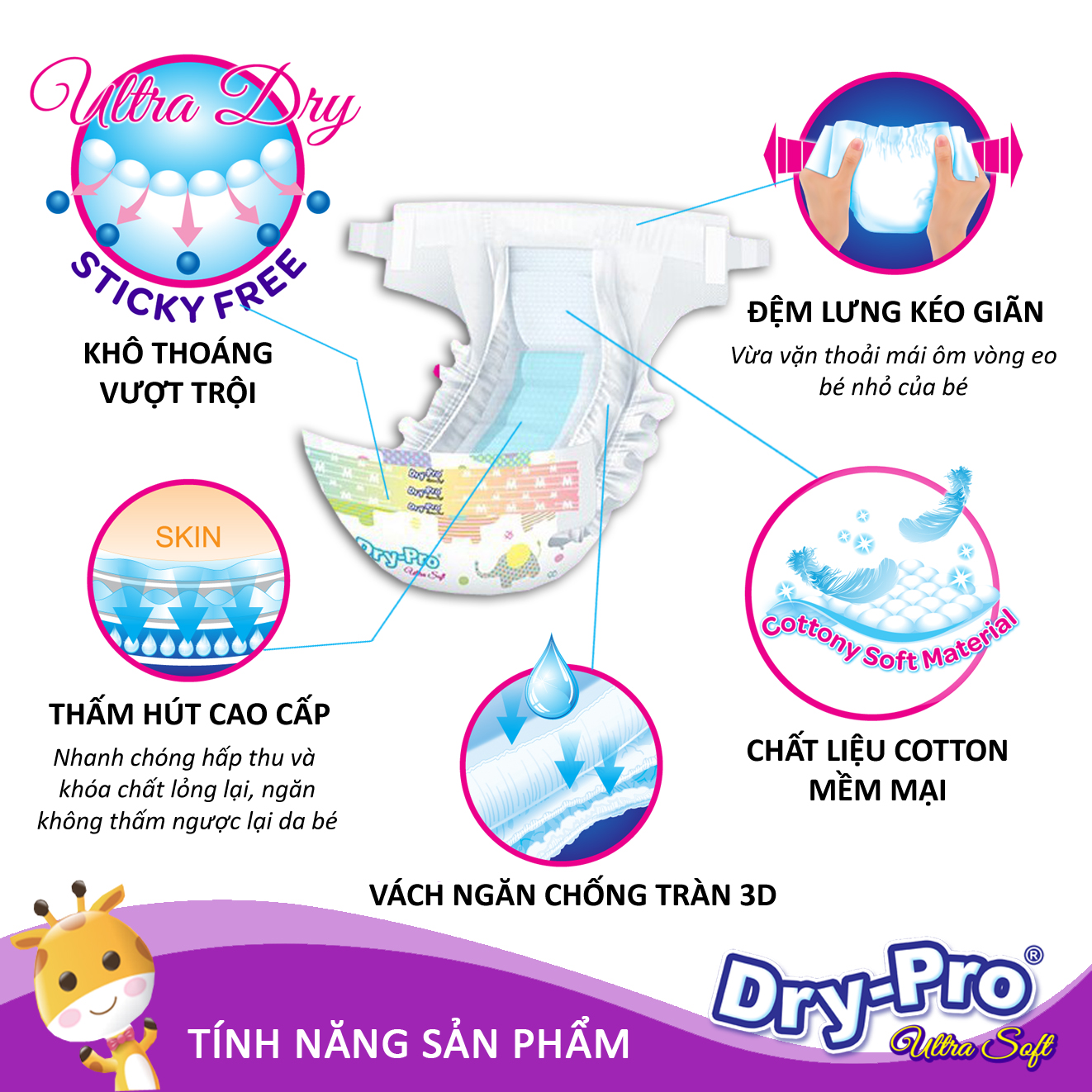 Tã dán Dry-Pro đã và đang trở thành một trong những sự lựa chọn ưu tiên của các bà mẹ Việt bởi những ưu điểm hết sức vượt trội sau: -Khả năng thấm hút cực