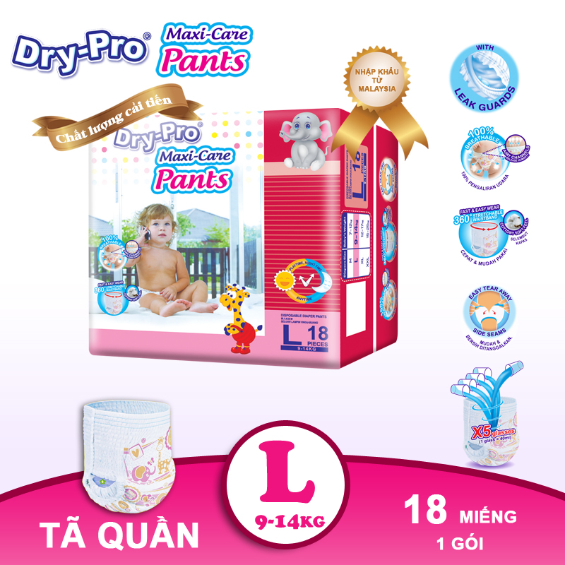 Tã quần Dry-Pro đã và đang trở thành một trong những sự lựa chọn ưu tiên của các bà mẹ Việt bởi những ưu điểm hết sức vượt trội sau: 1.Lõi siêu thấm hút với bề mặt phân bổ chất lỏng FDL hiệu quả 2.Lưng thun co giãn 360 độ giúp mẹ mặc cho bé nhanh và dễ dàng, bé luôn thoải mái vận động cả ngày và ngủ êm ái suốt đêm. 3.Rãnh đứng 2 biên bảo vệ chống tràn, ngăn chất lỏng rò rỉ ra ngoài. 4.Lớp bông 100% cotton mềm mại, thoáng khí, nhẹ nhàng với làn da nhạy cảm của bé. 5.Đây là sản phẩm mới, đã được cải tiến về bao bì và chất lượng, mẹ mua ngay cho bé để dùng thử và cảm nhận nhé!   Nghiên cứu thị trường và đặc điểm trẻ em châu Á, nhà sản xuất Dry-Pro cung cấp cho người dùng rất nhiều loại bỉm khác nhau phù hợp với độ tuổi, cân nặng và cơ địa bé: -Bỉm quần size M: thấm hút 350ml nước -Bỉm quần size L: thấm hút 520ml nước -Bỉm quần size XL: thấm hút 550ml nước -Bỉm quần size XXL: thấm hút 600ml nước     Cách chọn size tã quần Dry-Pro cho bé: -Size M: cho bé từ 7-12 ký -Size L: cho bé từ 9-14 ký -Size XL: cho bé từ 12-17 ký -Size XXL: cho bé từ 15-25 ký     Dry-Pro có dòng tã quần Maxi-Care và tã dán Ultra-Soft, mẹ xem bảng quy đổi sau để kết hợp chọn loại tã phù hợp cho hoạt động cả ngày của bé sao cho bé luôn thoải mái mà lại tiết kiệm (ví dụ mẹ có thể dùng tã quần lúc ban ngày và tã dán trong lúc bé ngủ)             Lưu ý: -Tránh xa tầm tay trẻ em, bao bì tã bằng nhựa và tã quần trẻ em có thể gây ngạt thở, không vứt tã đã sử dụng vào bồn cầu -Để tránh kích ứng da, lau mông cho bé sạch và khô Bảo quản: Nơi khô ráo, thoáng mát, tránh để gần lửa và nơi có nhiệt độ cao.         Thông tin thương hiệu: Dry-Pro là thương hiệu tã bỉm em bé chất lượng cao với giá thành hợp lý được ưa chuộng tại thị trường Malaysia và các nước khác trên 19 năm. Dry-Pro đảm bảo đem đến sự chăm sóc chuyên nghiệp cho trẻ sơ sinh và trẻ nhỏ trên khắp thế giới với nhiều loại tã bỉm đa dạng.