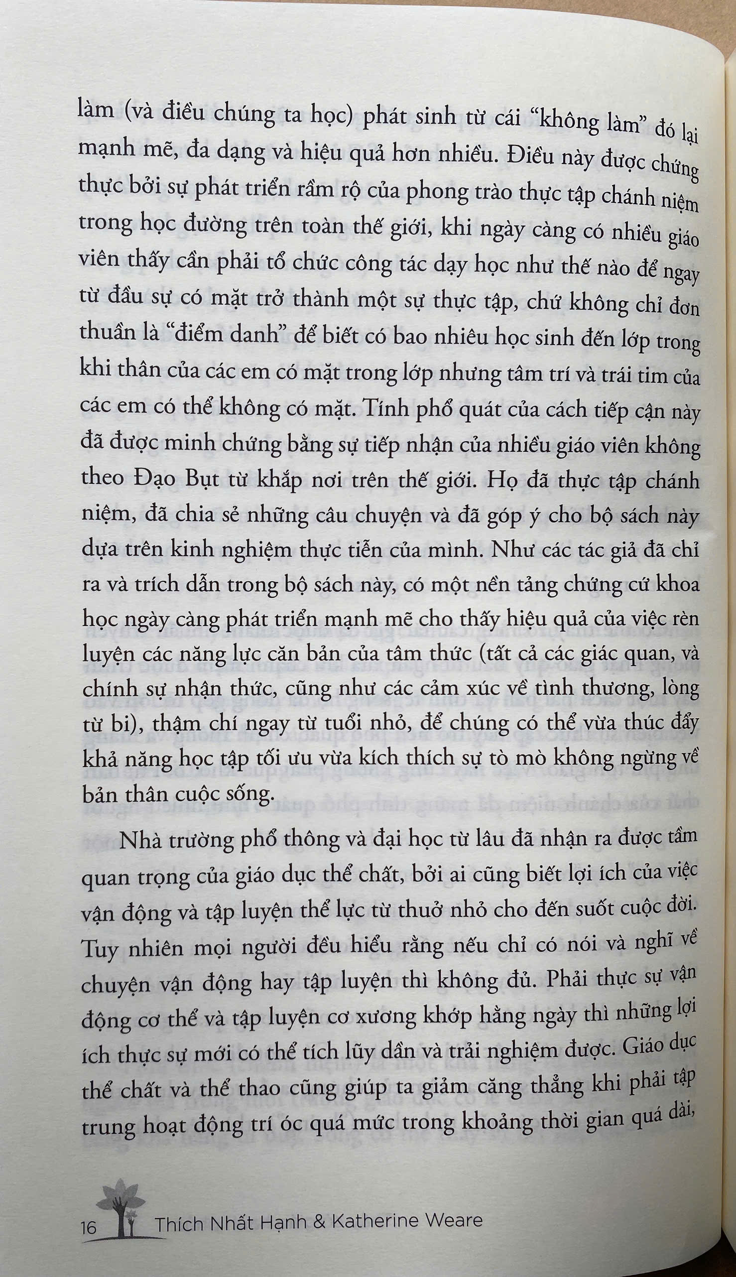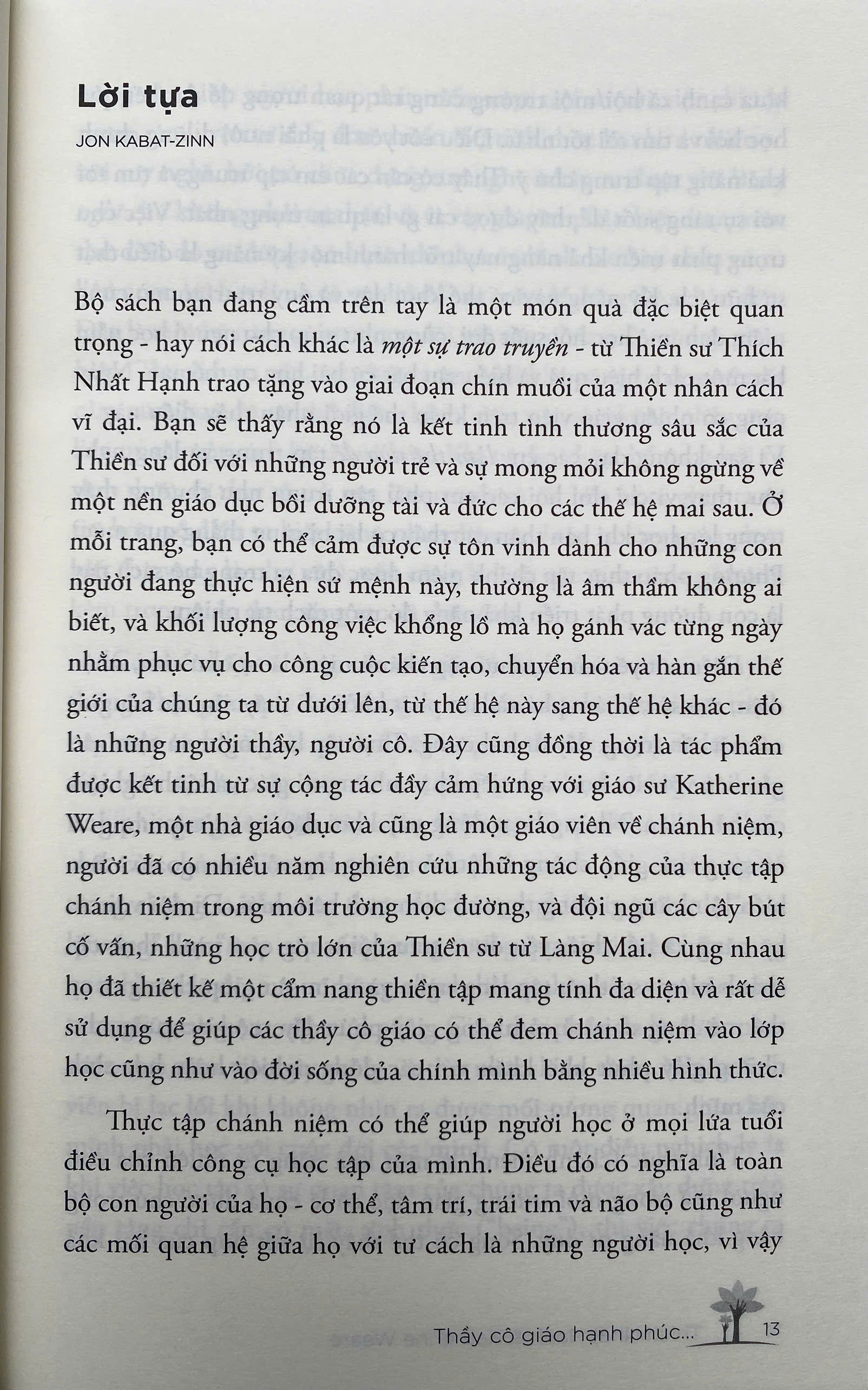 “Thầy cô giáo hạnh phúc sẽ thay đổi thế giới” - bộ sách bạn đang cầm trên tay là một món quà đặc biệt quan trọng - hay nói cách khác là một sự trao truyền - từ Thiền sư Thích Nhất Hạnh trao tặng vào giai đoạn chín muồi của một nhân cách vĩ đại. Bạn sẽ thấy rằng nó là kết tinh tình thương sâu sắc của Thiền sư đối với những người trẻ và sự mong mỏi không ngừng về một nền giáo dục bồi dưỡng tài và đức cho các thế hệ mai sau. Ở mỗi trang, bạn có thể cảm được sự tôn vinh dành cho những con người đang thực hiện sứ mệnh này, thường là âm thầm không ai biết, và khối lượng công việc khổng lồ mà họ gánh vác từng ngày nhằm phục vụ cho công cuộc kiến tạo, chuyển hóa và hàn gắn thế giới của chúng ta từ dưới lên, từ thế hệ này sang thế hệ khác - đó là những người thầy, người cô. Đây cũng đồng thời là tác phẩm được kết tinh từ sự cộng tác đầy cảm hứng với giáo sư Katherine Weare, một nhà giáo dục và cũng là một giáo viên về chánh niệm, người đã có nhiều năm nghiên cứu những tác động của thực tập chánh niệm trong môi trường học đường, và đội ngũ các cây bút cố vấn, những học trò lớn của Thiền sư từ Làng Mai. Cùng nhau họ đã thiết kế một cẩm nang thiền tập mang tính đa diện và rất dễ sử dụng để giúp các thầy cô giáo có thể đem chánh niệm vào lớp học cũng như vào đời sống của chính mình bằng nhiều hình thức. Bộ sách gồm 2 cuốn: Tập 1 “Cẩm nang hạnh phúc”, tập 2 “Đi như một dòng sông” Trong cuốn “Cẩm nang hạnh phúc” thầy Thích Nhất Hạnh và tác giả Katherine Weare sẽ chia sẻ chi tiết về chánh niệm và tỉnh thức. Bởi thế giới đang thay đổi quá nhanh đến nỗi chúng ta không thực sự biết được nền tảng tri thức và kỹ năng nào sẽ là quan trọng nhất mà các thế hệ kế cận cần phải trau dồi. Nhưng điều mà chúng ta có thể biết chắc là muốn sáng tạo, yêu nghề, thích nghi với thời đại kỹ thuật số và học hỏi suốt đời thì người trẻ ở lứa tuổi nào cũng cần phải phát triển kỹ năng sống với giây phút hiện tại. Điều này bao gồm kỹ năng làm bạn với chính mình, tin tưởng những trải nghiệm trong nội tâm và học cách làm chủ môi trường bên trong, gồm thân và tâm của mình, cũng như biết cách thích nghi với môi trường học tập bên ngoài khi tương tác với những người khác. Đánh thức khả năng sáng tạo và trí tưởng tượng của bản thân trong suốt cuộc đời theo cách thức này là một yếu tố quan trọng dẫn tới thành công và hạnh phúc như tiêu đề của  bộ sách. Một trong những nguyên tắc chính ở đây là các thầy cô giáo cần thực tập chánh niệm trong đời sống của chính mình trước khi có thể đưa nó vào lớp học một cách hiệu quả. Nếu bạn làm nghề giáo và mới biết đến phương pháp chánh niệm, bộ sách này sẽ hướng dẫn hết sức chi tiết cách bạn thực tập cho chính mình, cũng như cách bạn có thể đưa nó vào lớp học theo cách riêng của mình để giúp học sinh phát triển lành mạnh về thể chất và tinh thần, biết cách chăm sóc cảm xúc và có niềm vui trong khi học. Cần lưu ý rằng không có một phương pháp nào là phù hợp cho mọi hoàn cảnh. Cái hay của cách nhìn này là cho bạn một loạt các lựa chọn để thử nghiệm và trên hết là nhắc bạn nhớ rằng chính sự sáng tạo của riêng bạn, được nuôi dưỡng bởi sự thực tập chánh niệm, sẽ mang đến muôn vàn những cơ hội mới và đầy thú vị. Nói một cách thực tế thì học trò của bạn sẽ là người giúp khơi mở nguồn tuệ giác đó trong bạn. Các em chính là những người thầy chánh niệm vĩ đại nhất của bạn. Điểm hay của phương thức tiếp cận này là nó có thể bắt nguồn từ tình yêu nghề và tấm lòng mong mỏi học trò tiến bộ, được ấp ủ và truyền đạt bởi chính trực giác và kinh nghiệm thực tiễn của bạn; tất cả những điều này đều dựa vào công phu thực tập trong từng thời khắc của bạn. Theo như tôi nghiệm thấy, những băn khoăn, học hỏi, quán chiếu cứ lớn lên không ngừng trên mảnh đất nuôi dưỡng ấy.