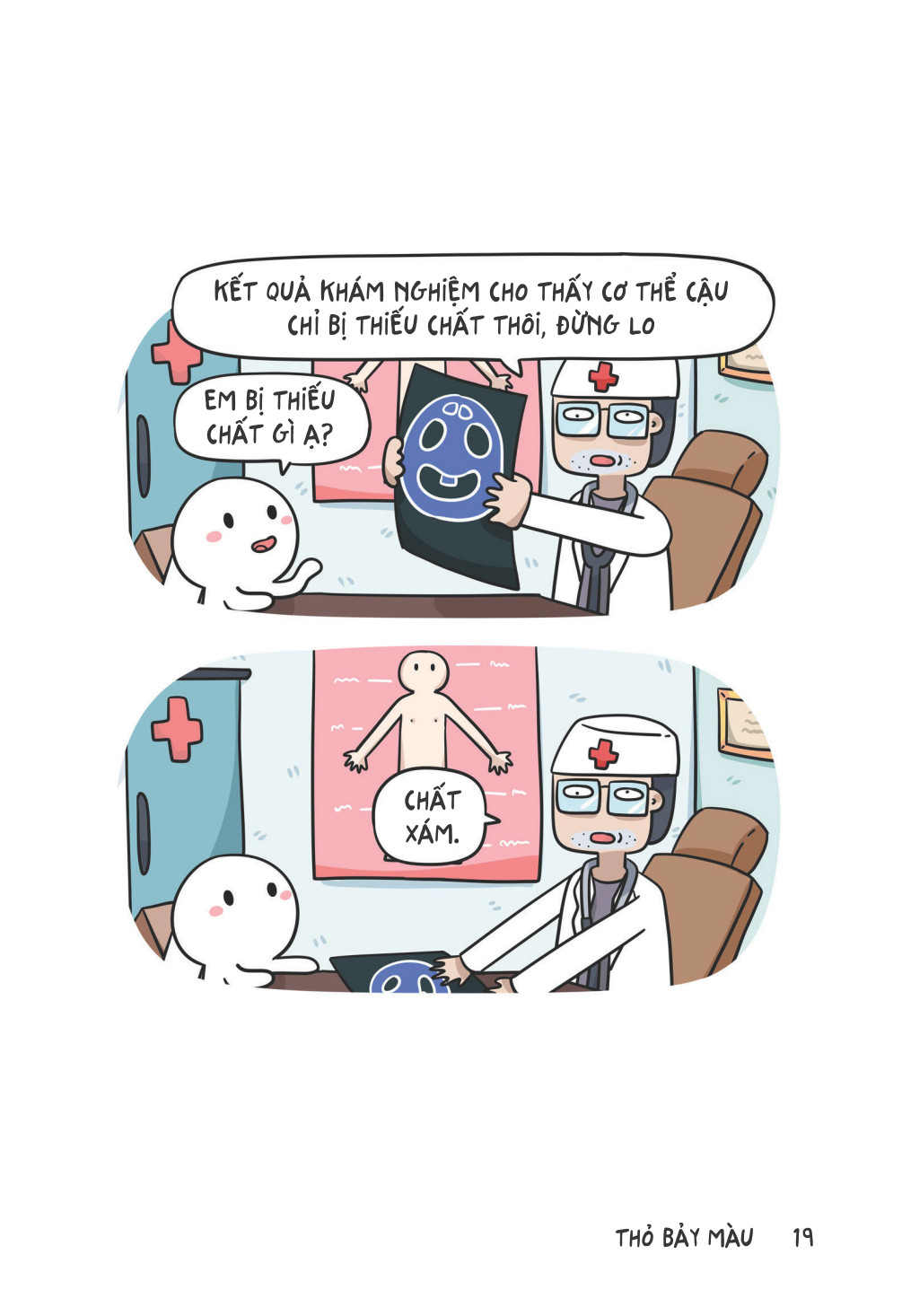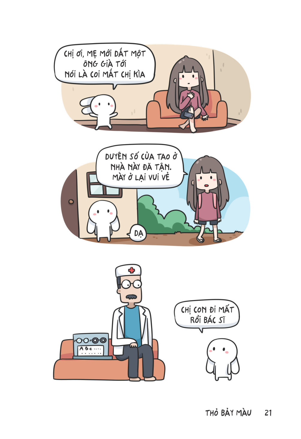 Thỏ Bảy Màu đơn giản chỉ là một con thỏ trắng với sự dở hơi, ngang ngược nhưng đáng yêu vô cùng tận. Nó luôn nghĩ rằng mình không có cuộc sống và không có bạn bè. Tuy nhiên, Thỏ lại chẳng bao giờ thấy cô đơn vì đến cô đơn cũng bỏ nó mà đi. Cuốn sách là những mẩu chuyện nhỏ được ghi lại bằng tranh xoay quanh Thỏ Bảy Màu và những người nghĩ nó là bạn. Những mẩu chuyện được truyền tải rất “teen” đậm chất hài hước, châm biếm qua sự sáng tạo không kém phần “mặn mà” của tác giả càng trở nên độc đáo và thu hút.