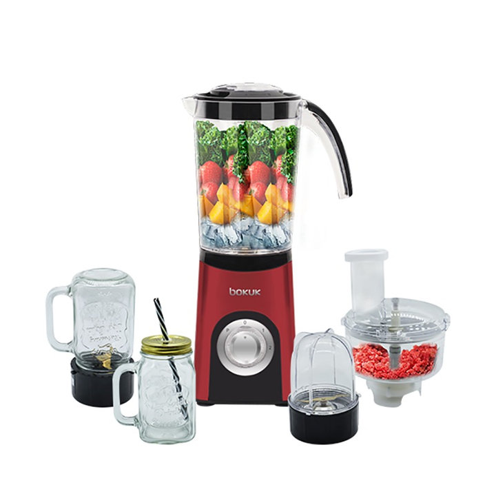 Máy xay đa năng nhiều cối cao cấp Bokuk BKBB-19410RD nhỏ gọn, màu đỏ đen bắt mắt giúp điểm tô không gian bếp thêm phần sang trọng và tinh tế.