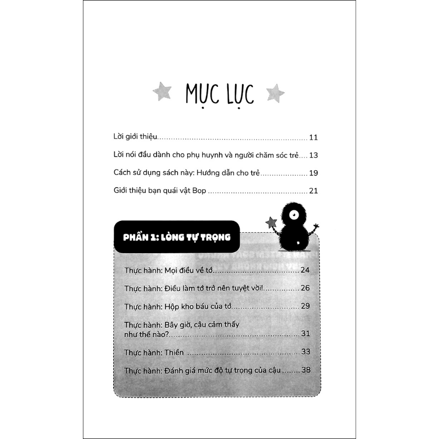 • Nhân vật Bop, một nhân vật thân thiện và đồng cảm, dẫn dắt trẻ em qua các bài tập và hoạt động trong sách. Bop giúp trẻ hiểu và quản lý cảm xúc của mình, đồng thời cung cấp các mẹo và câu nói truyền cảm hứng để khuyến khích trẻ tự tin hơn trong các tình huống xã hội.