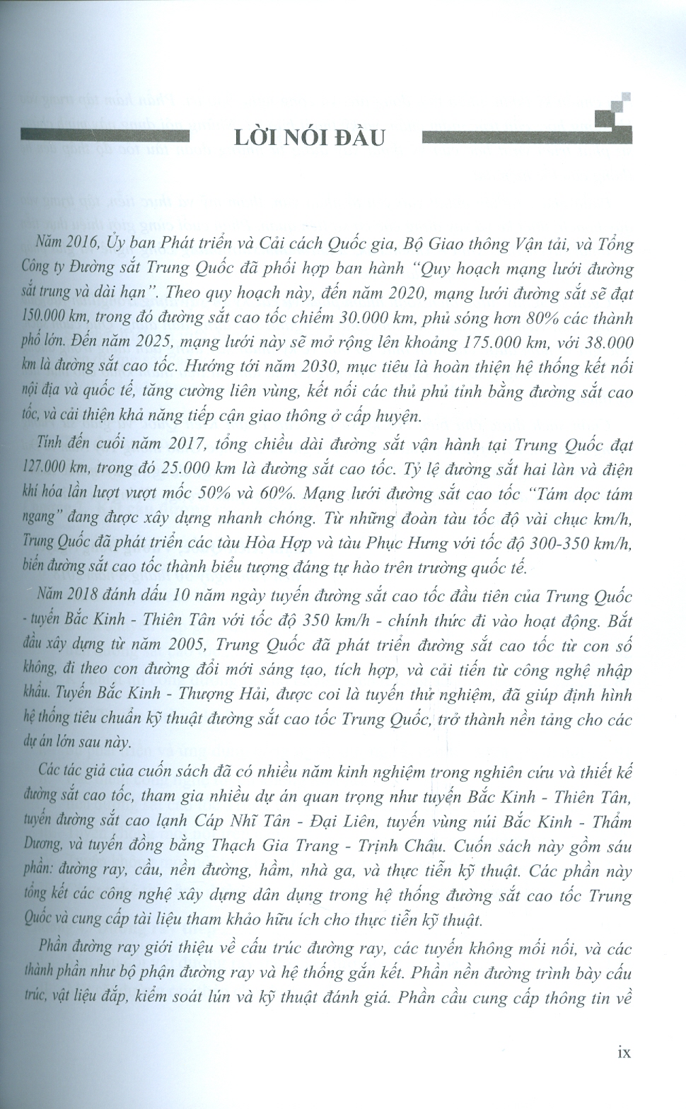 Cuốn sách này được biên soạn nhằm phục vụ các kỹ sư xây dựng trong lĩnh vực giao thông, sinh viên và nghiên cứu sinh chuyên ngành xây dựng dân dụng. Qua cuốn sách, đọc giả sẽ nắm được các kiến thức cơ bản về kỹ thuật xây dựng dân dụng trong đường sắt cao tốc Trung Quốc, và cuốn sách cũng có thể làm tài liệu tham khảo cho thực tiễn kỹ thuật tại Việt Nam trong quá trình xây dựng tuyến Đường sắt cao tốc Bắc - Nam thời gian tới.