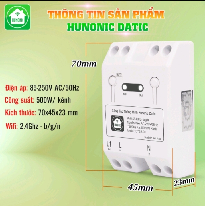 - Đây là một thiết bị không thể thiếu trong ngôi nhà thông minh của bạn Mã sản phẩm: HN01SD THÔNG SỐ KĨ THUẬT Model: DTBS – 01 Wifi: 2.4Ghz – b/g/n Nguồn vào: AC220/ 50Hz Công suất tải: 500W/kênh Kích thước: 70x45x23 mm