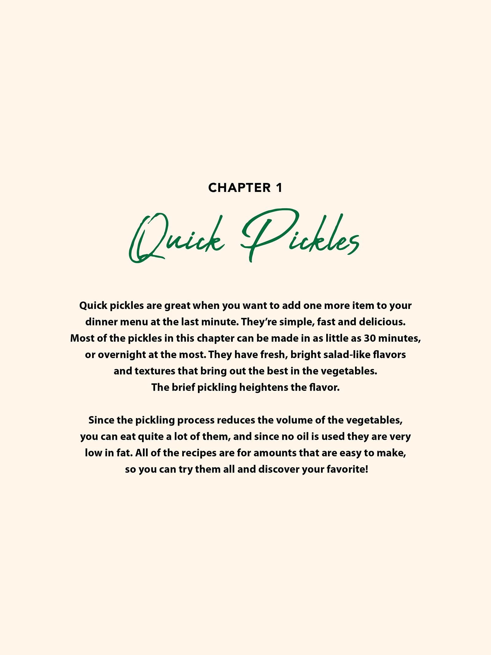 Chapter One: Quick pickles that are ready to eat immediately--like Spicy Eggplant Pickles, Cabbage and Garlic Pickled in Soy Sauce, and Tomatoes Seasoned in Sake Rice Wine