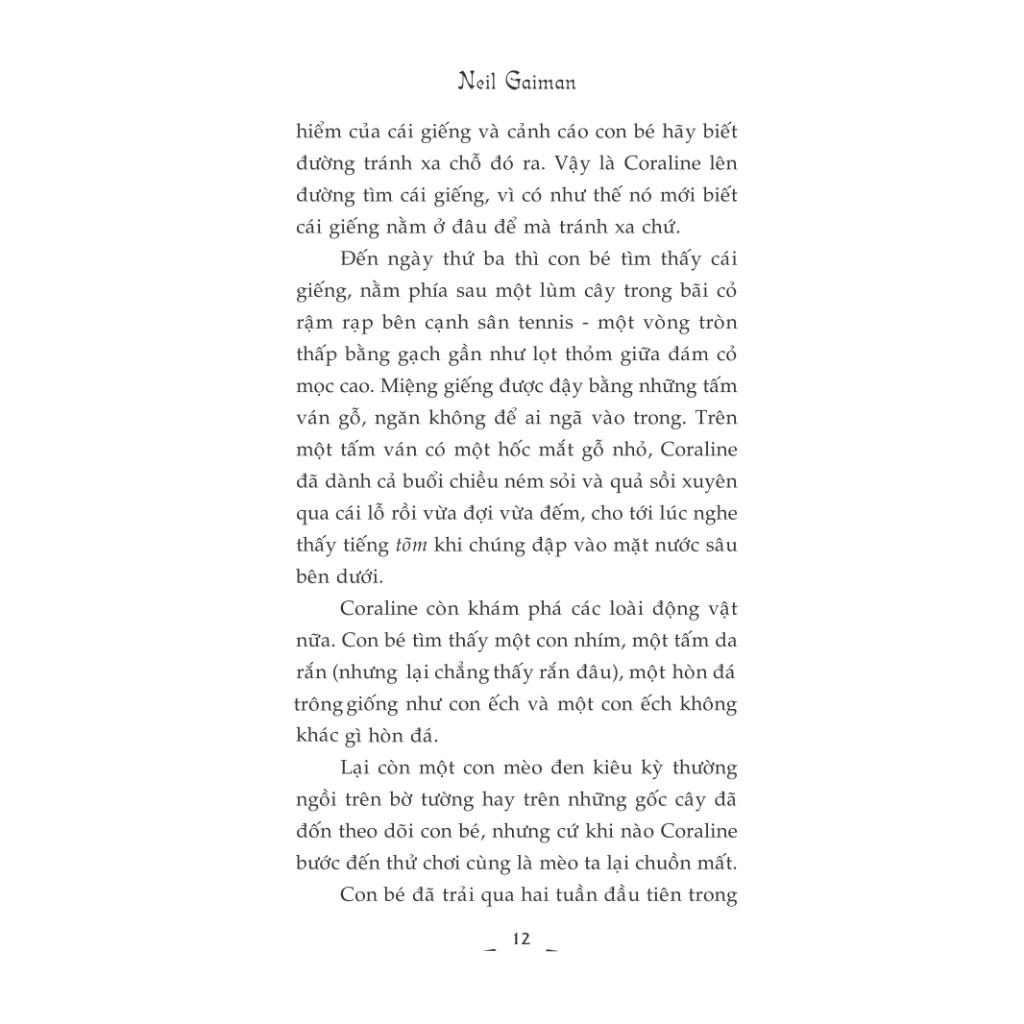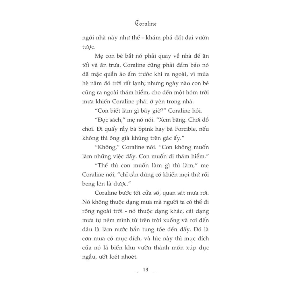 Tác giả: Neil GaimanDịch giả: Linh VũNhà xuất bản: Hội nhà vănSố trang: 218Ngày phát hành: 10-2023Khi Coraline bước qua cánh cửa, nó nhìn thấy một ngôi nhà giống hệt nhà mình. Chỉ có điều, mọi thứ dư...