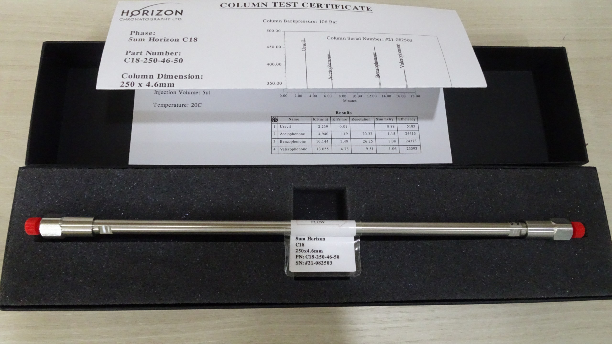 Cột sắc ký HPLC & UHPLC: Thương hiệu: Horizon Chromatography Loại cột (Stationary Phase): C18 HPLC Năm sản xuất: 2022 Particles sizes: 5µm Dimension: 250 mm x 4.6mm Surface Area: 300 Pore Size 120 A