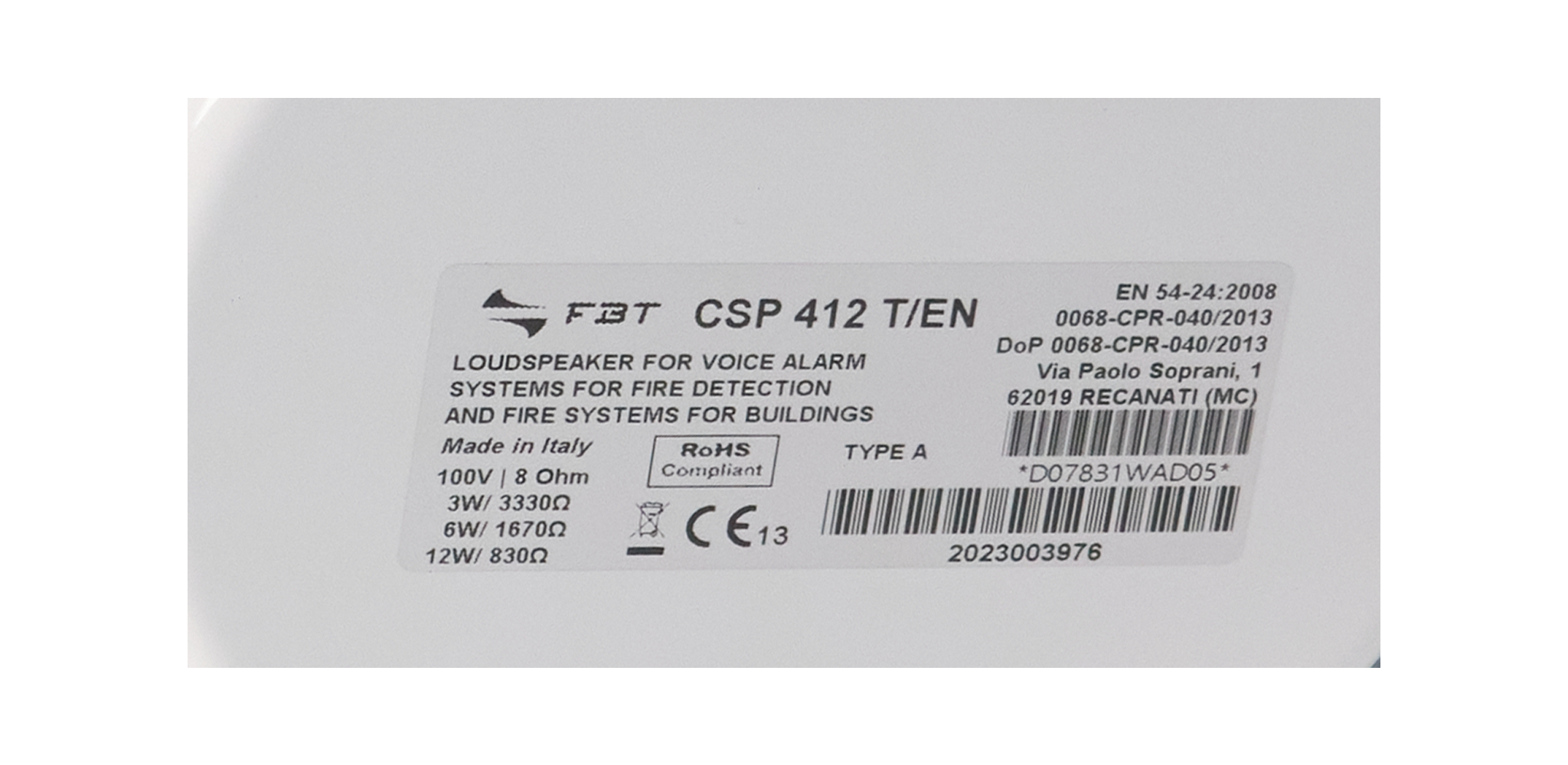 Tính năng nổi bật  FBT Nhập khẩu từ Ý  Bộ loa CSP 406 T/EN và CSP 412 T/EN, thích hợp để gắn trên trần  Đảm bảo khả năng tái tạo xuất sắc cả giọng nói và âm nhạc CSP 412 T/EN là trần chống cháy bằng thép có công suất điều chỉnh 12/6/3W và 100/70/50V. Cái này có màu trắng. Thông tin sản phẩm Bộ CSP 406 T/EN và CSP 412 T/EN, thích hợp để gắn trên trần giả, đảm bảo khả năng tái tạo xuất sắc cả giọng nói và âm nhạc. Được làm bằng tấm kim loại dập nổi được xử lý bằng sơn trắng chống xước và không phản chiếu, chúng sẽ phù hợp một cách trang nhã với mọi môi trường. Mỗi bộ phận bao gồm một vòng chịu lực với các móc lắp nhanh bằng lò xo để dễ dàng cố định vào trần nhà. Mặt nạ trung tâm với loa được nối với biến áp đường dây vừa với vòng bằng chuyển động xoay tiện dụng. Theo thông số kỹ thuật của hệ thống sơ tán bằng giọng nói EN 54-24, dòng loa này có nắp chống cháy bằng thép mạ kẽm kép, kết hợp với các dải đầu vào/đầu ra bằng gốm, cầu chì nhiệt và đầu tiếp đất. Máy biến áp tích hợp cho phép kết nối với các đường dây điện áp không đổi ở 100,