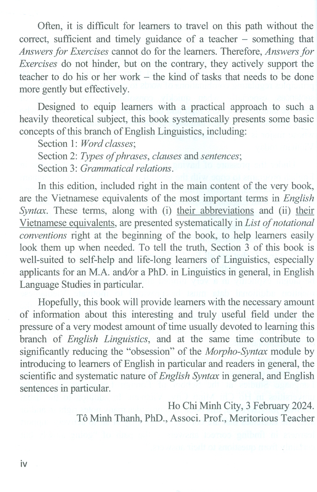 Quyển sách English Syntax được hình thành dựa trên các tư liệu đã được dùng để giảng dạy cho sinh viên chuyên ngữ Anh của Khoa Ngoại ngữ tại các trường đại học ở Thành phố Hồ Chí Minh trong thời gian qua. Ngoài Đáp án của bài tập (Answers for Exercises) như thông lệ, quyển sách này còn cung cấp nhiều ghi chú bằng cả tiếng Anh lẫn tiếng Việt ngay trong phần lý thuyết và/hoặc sau các bài tập được coi là không dễ nhằm tích cực hỗ trợ người học tìm ra con đường "đi chậm mà chắc từ đề bài đến đáp án".