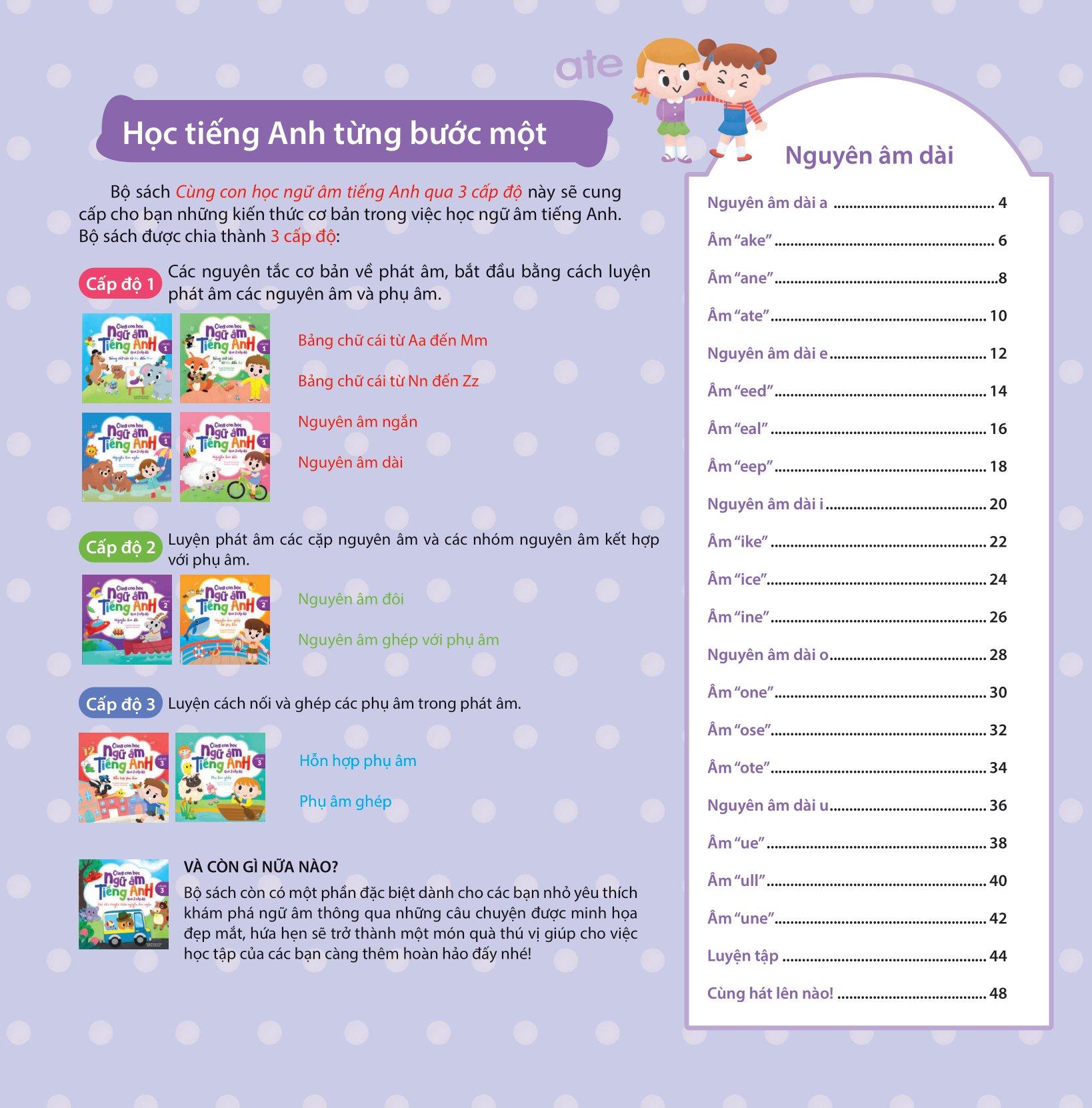 Với những ví dụ sinh động, dễ tiếp thu, kèm theo các bài thực hành nâng cao đầy tính thực tiễn và các audio dạy phát âm chuẩn bằng giọng Anh-Mỹ bản xứ, bộ sách sẽ cung cấp cho các em những kiến thức cần thiết để học ngữ âm tiếng Anh. Đúng như tên gọi, bộ sách được chia thành ba cấp độ từ cơ bản đến phức tạp, hướng dẫn các em rèn luyện từng bước một để nắm chắc các âm trong tiếng Anh. Ngoài ra, bộ sách còn lồng ghép những bài hát vui nhộn và những câu chuyện ngắn được minh họa đẹp mắt, hứa hẹn sẽ giúp cho việc học tập của các em thêm phần thú vị và hiệu quả.