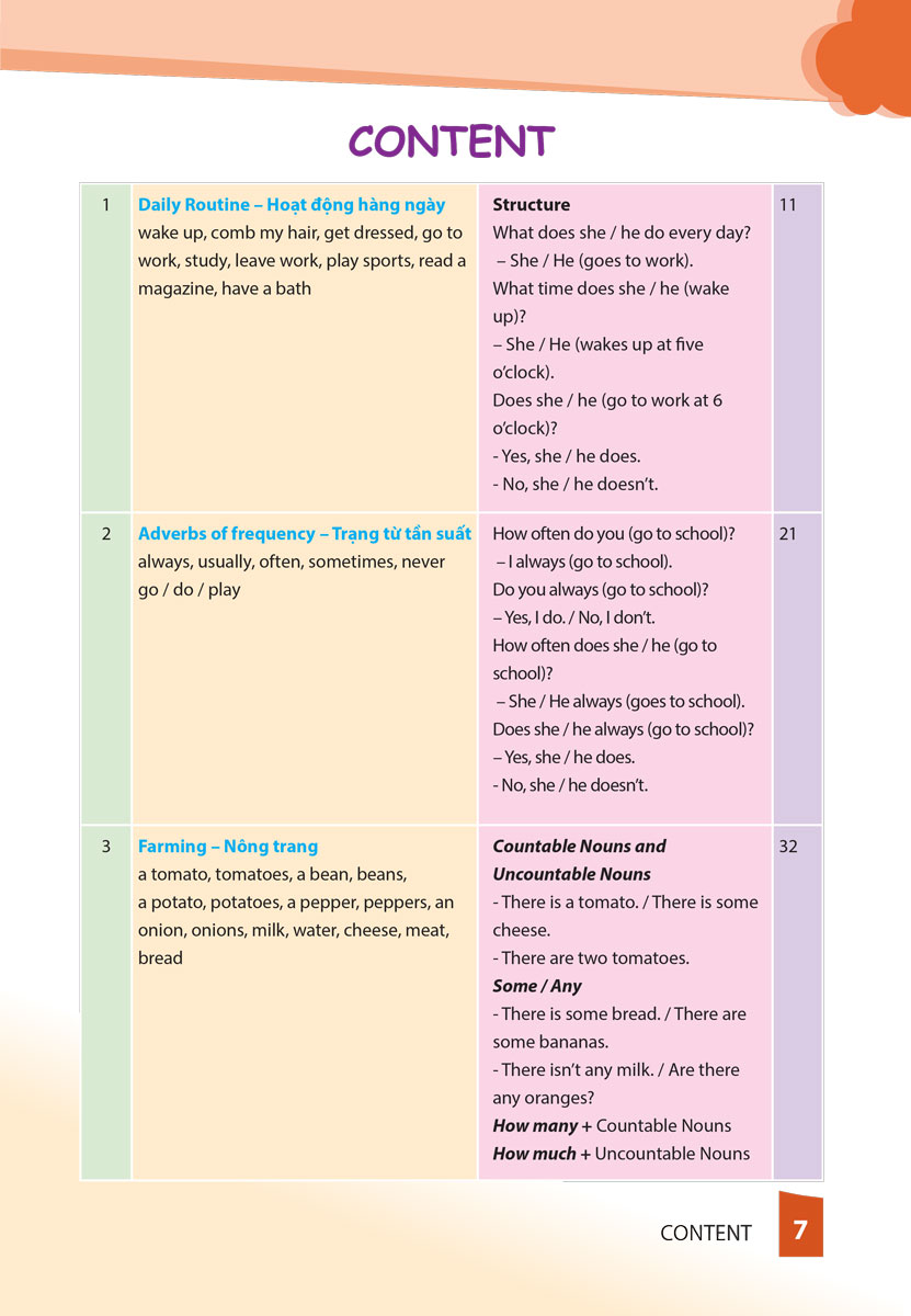Nội dung chương trình bao gồm các chủ đề Hoạt động hàng ngày – Trạng từ tần suất – Nông trang – Nghề nghiệp – Các bệnh thường gặp – Các môn học – Nơi chốn – Quá khứ đơn/Động từ có quy tắc; bất quy tắc – Nội quy trường học.