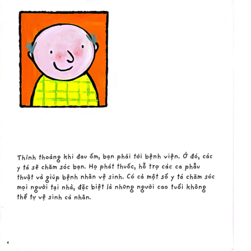 Cuốn Sách Lớn Rực Rỡ Về - Y Tá (Dành cho bạn nhỏ 3+) Giới thiệu sách Các y tá chăm sóc cho bệnh nhân. Họ đo thân nhiệt hay huyết áp, cấp phát thuốc và cùng bác sĩ điều trị cho bệnh nhân. Các y tá cũng hỗ trợ phẫu thuật, chăm sóc người cao tuổi ở nhà dưỡng lão, hay chăm nom bệnh nhân tại nhà.
