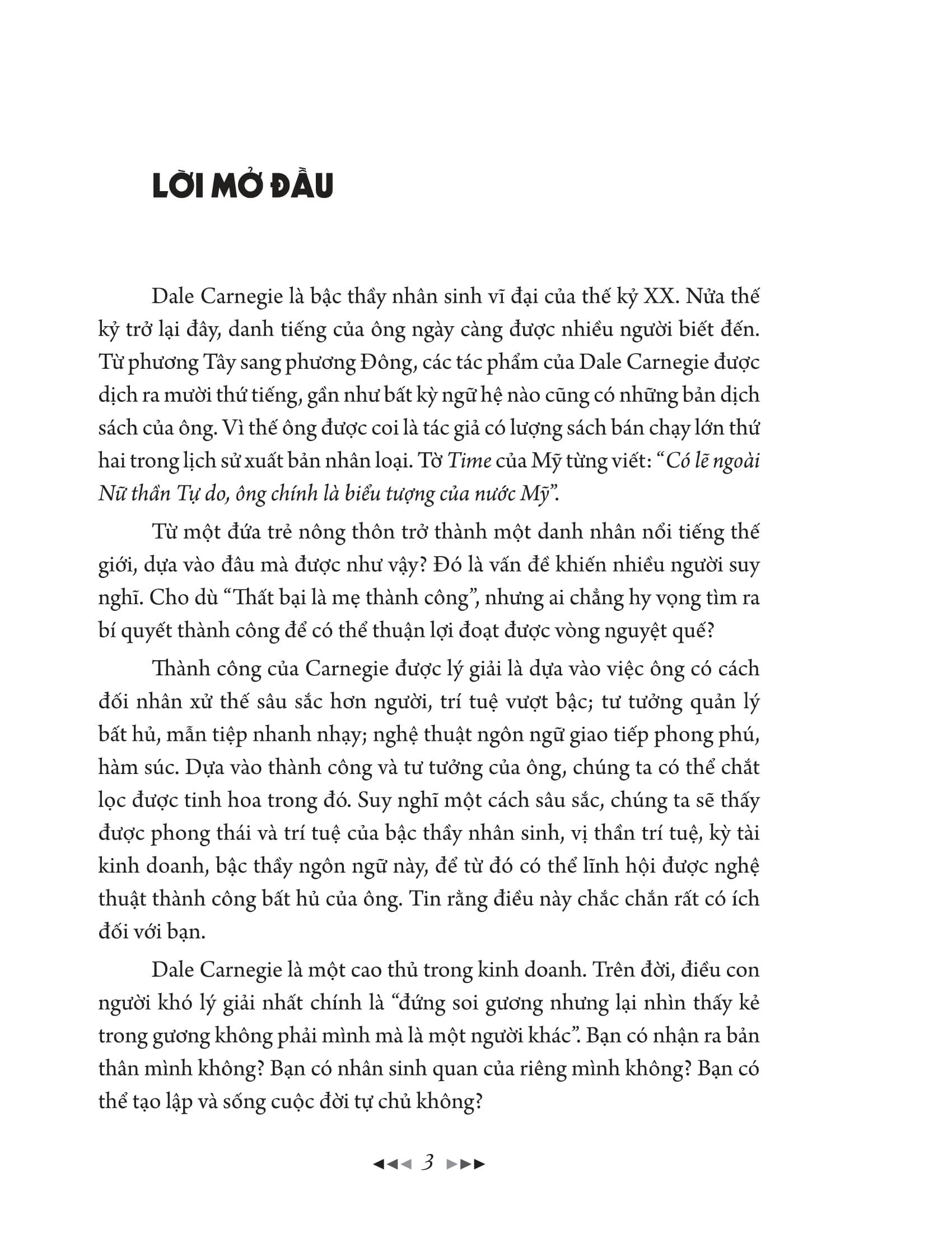 Dale Carnegie là bậc thầy nhân sinh vĩ đại của thế kỷ XX. Nửa thế kỷ trở lại đây, danh tiếng của ông ngày càng được nhiều người biết đến. Từ phương Tây sang phương Đông, các tác phẩm của Dale Carnegie được dịch ra mười thứ tiếng, gần như bất kỳ ngữ hệ nào cũng có những bản dịch sách của ông. Vì thế ông được coi là tác giả có lượng sách bán chạy lớn thứ hai trong lịch sử xuất bản nhân loại. Tờ Time của Mỹ từng viết: “Có lẽ ngoài Nữ thần Tự do, ông chính là biểu tượng của nước Mỹ”.