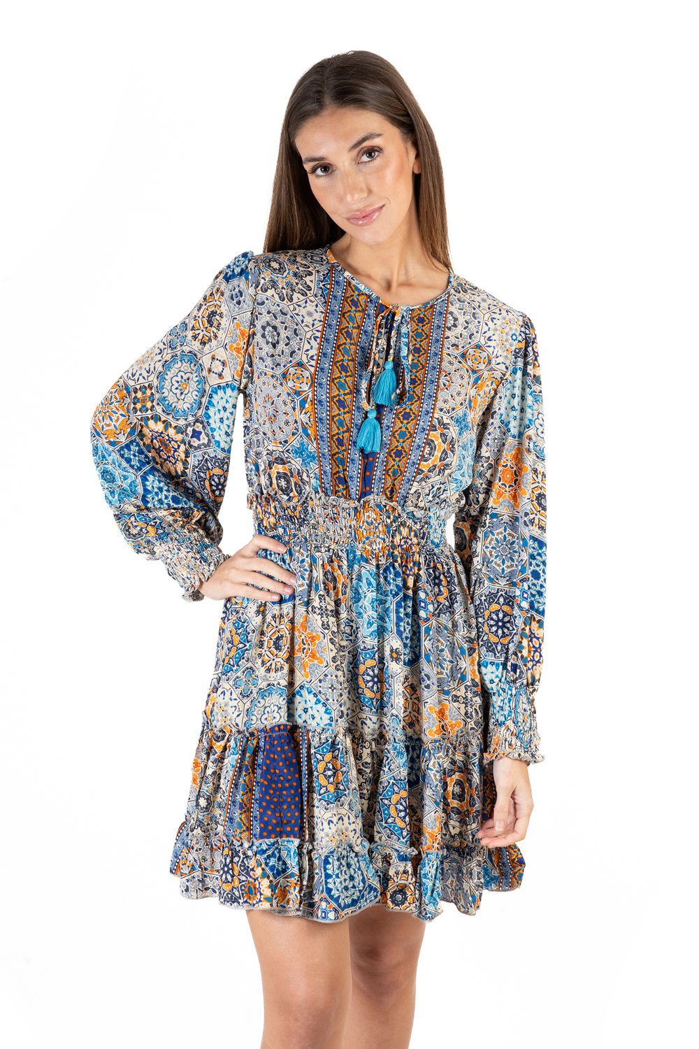 Đầm Boho Dài Tay Isla Bonita, chất lụa cao cấp, mềm mại, thun co giãn ở eo. Phom suông xòe rộng. Dài đầm 90cm (45x90) Phù hợp đi biển, dạo phố, công sở, hoặc dự