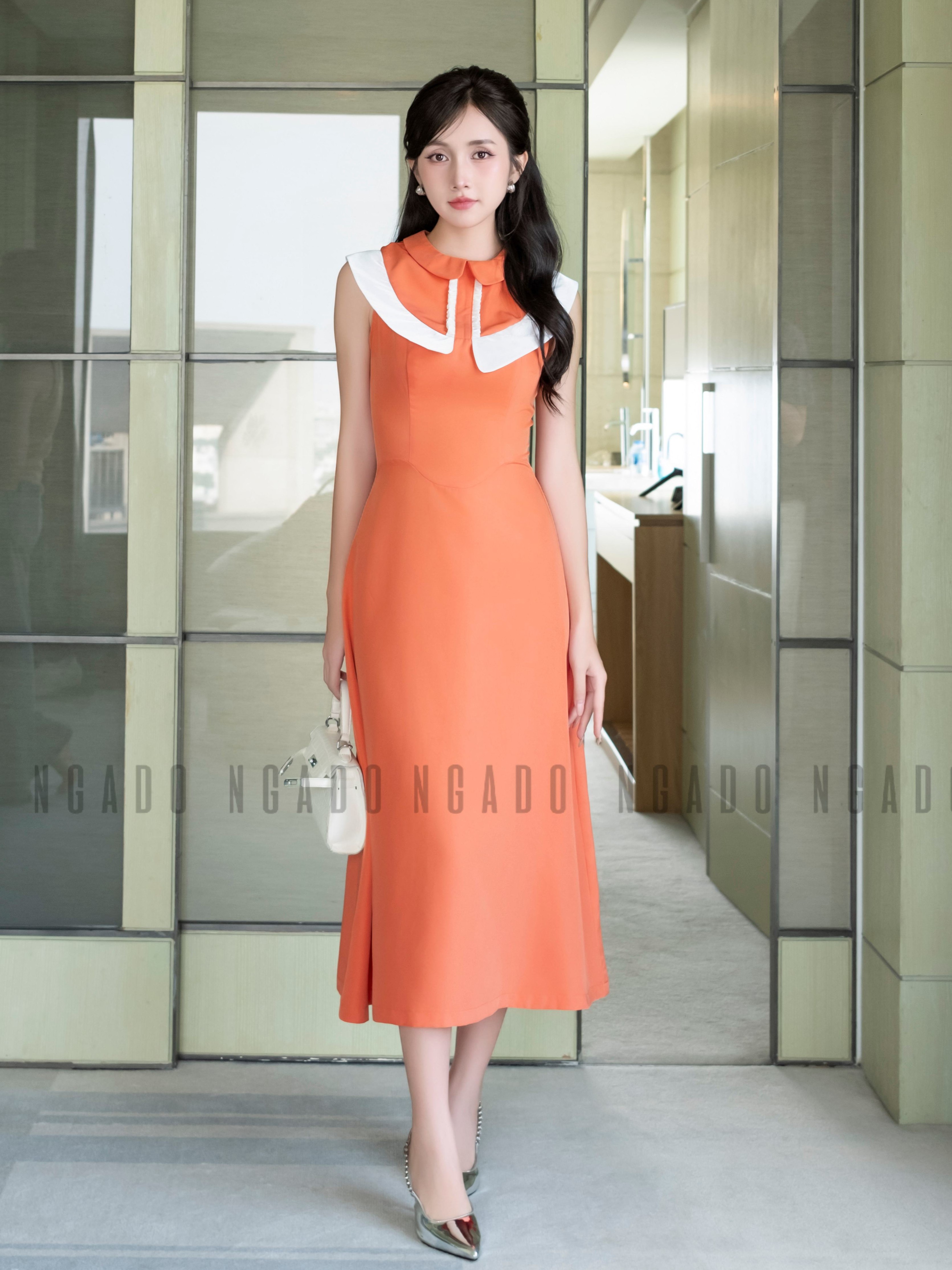 ✨Đầm cam cổ sen phối trắng NGADO, đầm dự tiệc , đầm dạo phố