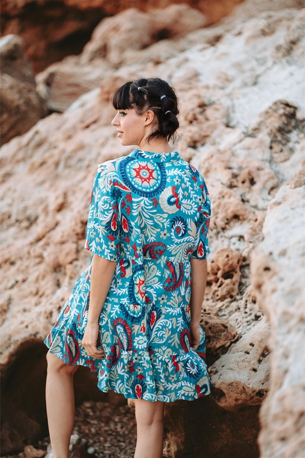 Đầm Boho Dài Tay Isla Bonita, chất lụa cao cấp, mềm mại, thun co giãn ở eo. Phom suông xòe rộng. Dài đầm 90cm (45x90) Phù hợp đi biển, dạo phố, công sở, hoặc dự