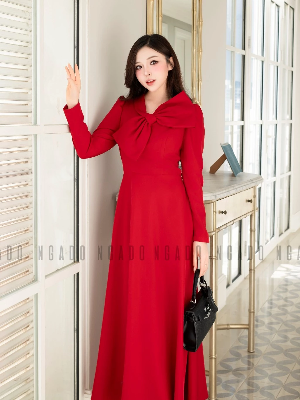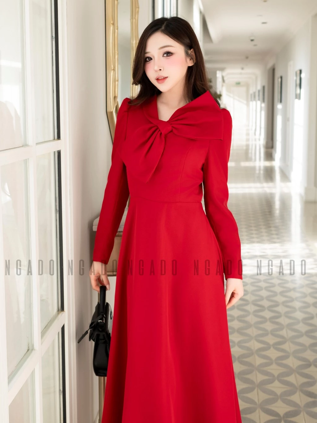 ✨Đầm đỏ cổ phối nơ NGADO , đầm dự tiệc dáng dài