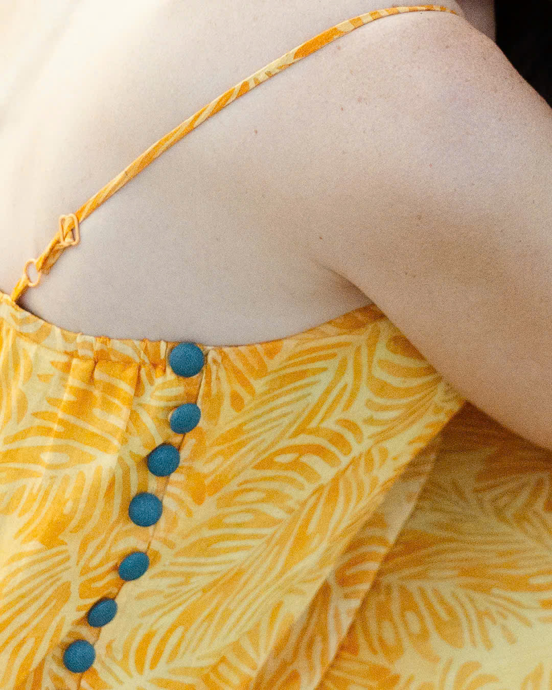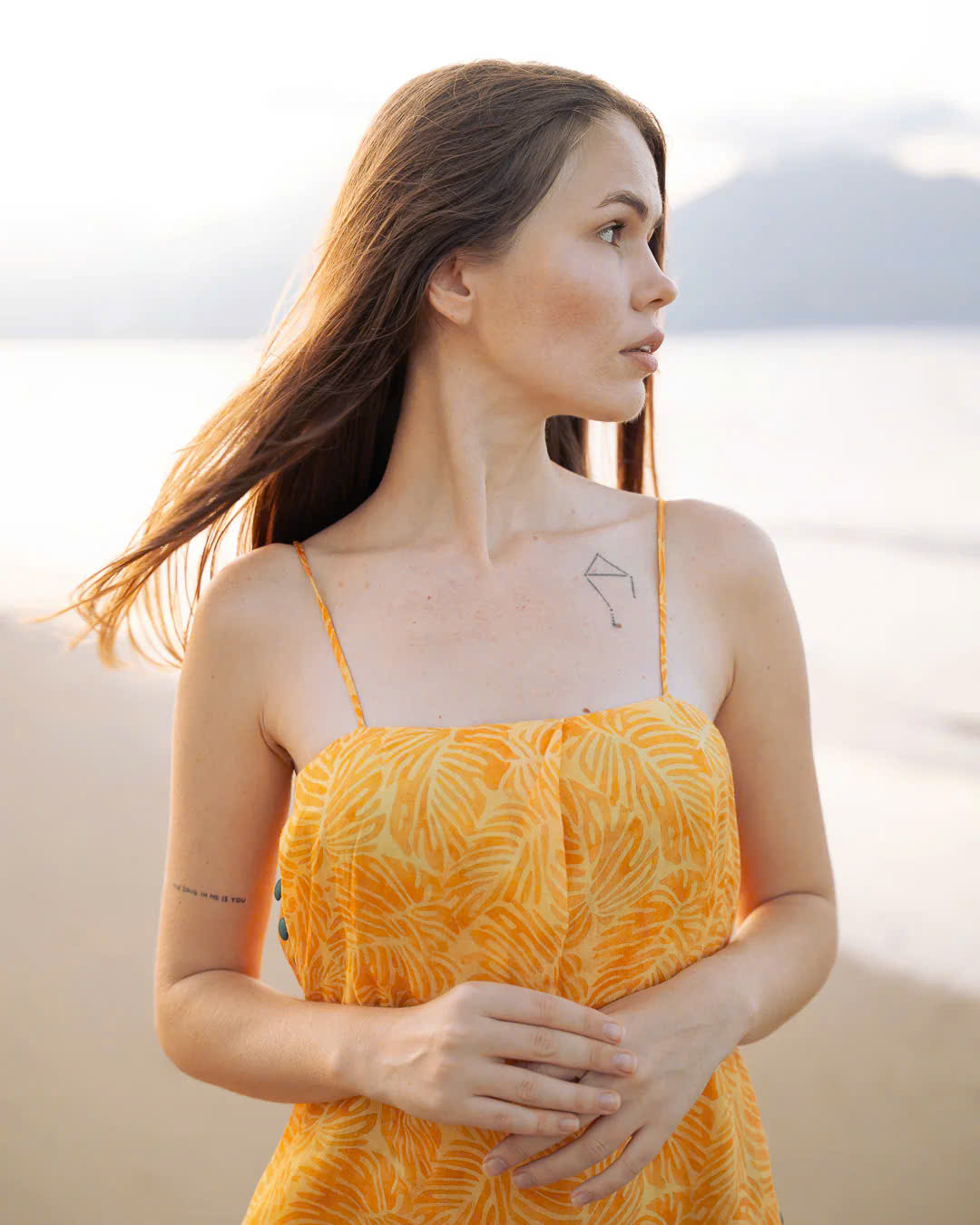 Cho những buổi tiệc cocktail dưới ánh hoàng hôn: Nâng tầm bộ trang phục với một đôi giày cao gót quai mảnh, clutch kim loại và trang sức vàng tối giản. Sắc vàng của chiếc đầm sẽ bắt sáng tuyệt vời, biến bạn thành tâm điểm của mọi ánh nhìn. HƯỚNG DẪN SỬ DỤNG Giặt máy ở nhiệt độ tối đa 30 độ C (86 độ F) Ủi ở nhiệt độ tối đa 110°C / 230°F, tương ứng với chế độ "Silk" hoặc ký hiệu một chấm (•) trên bàn ủi. Đặt một miếng vải bằng chất liệu tự nhiên lên mặt vải, ủi trên mặt vải, không ủi trực tiếp lên trang phục. Ưu tiên sử dụng bàn ủi hơi nước hoặc ủi khi trang phục còn ẩm. Lộn mặt trái khi ủi.