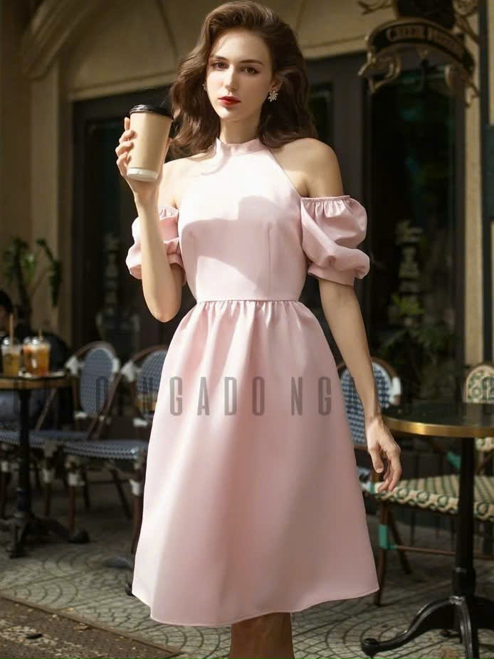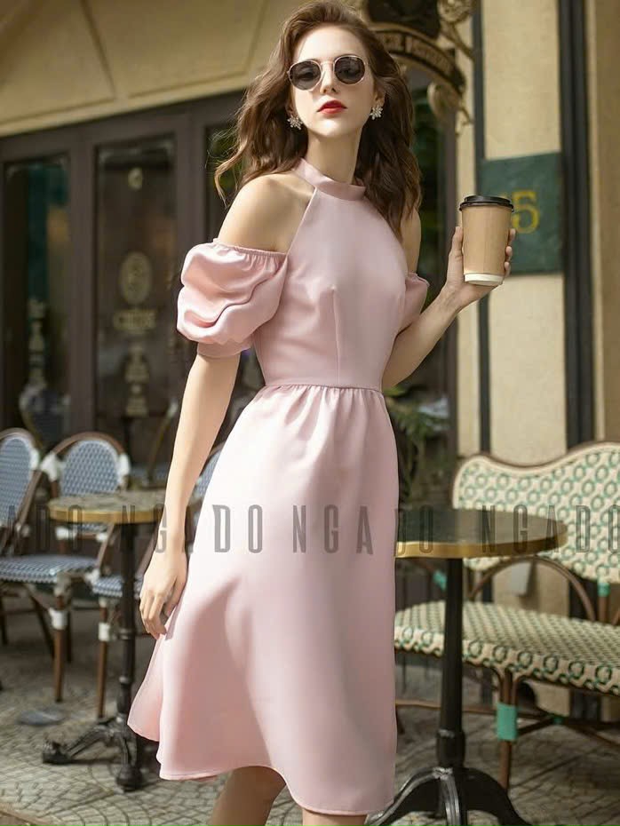 ✨Đầm hồng cổ yếm tay phồng NGADO , đầm cổ yếm , đầm kiểu Nữ
