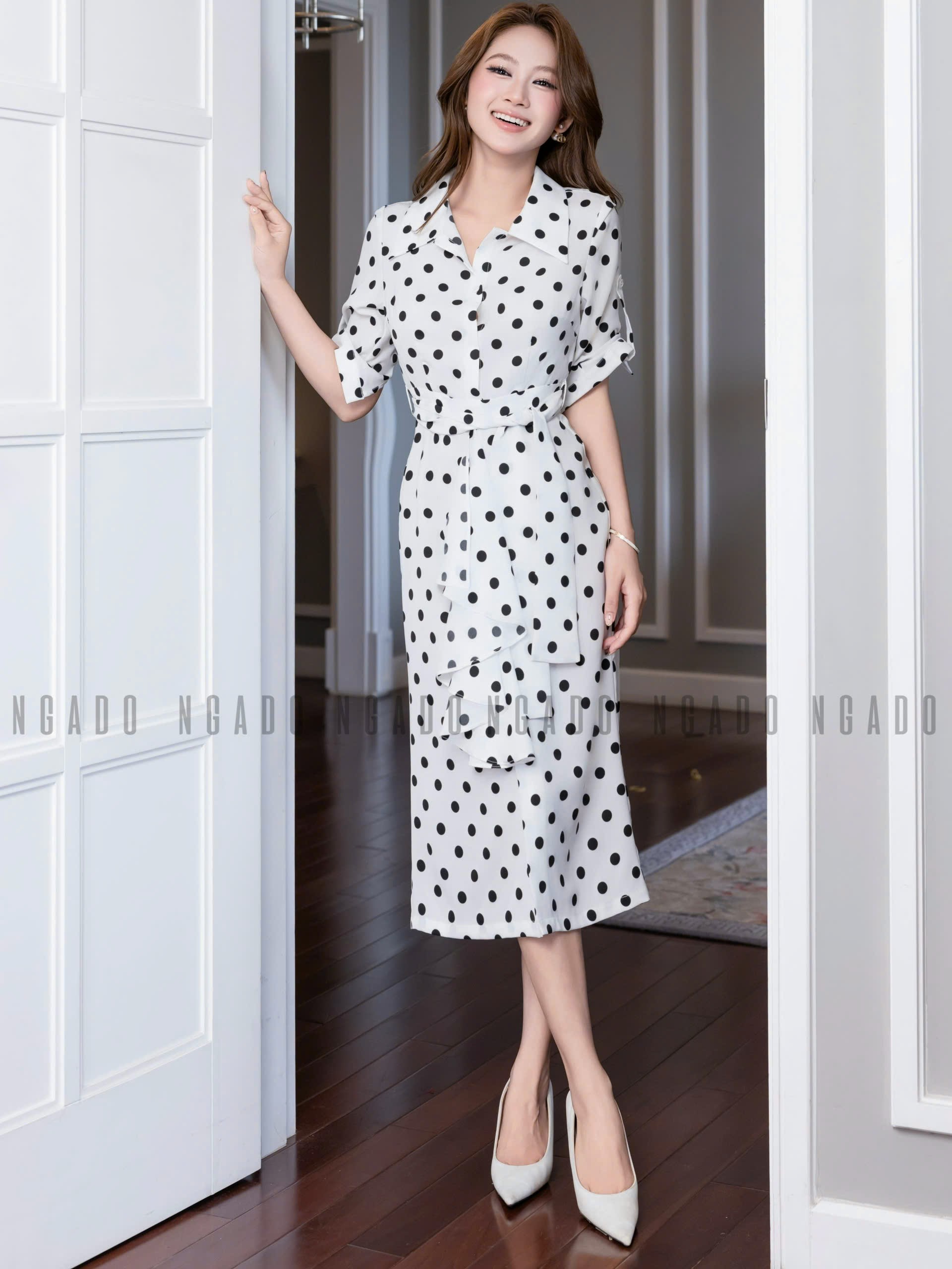 ✨Đầm sơ mi chấm bi tay lửng NGADO , đầm sơ mi , đầm chấm bi , đầm kiểu