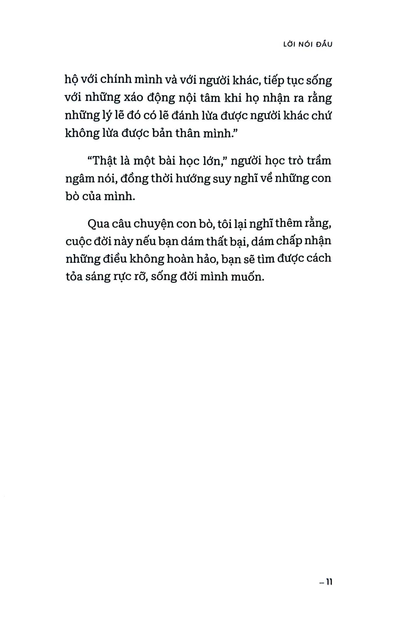 Để có câu trả lời, bạn cần học được tinh thần “DÁM THẤT BẠI” và bản lĩnh đón nhận thất bại ấy. Đừng biện minh, biện hộ thay cho cái tôi nhỏ nhen của bạn, hãy để cuộc đời là chính nó, trở thành như những gì nó muốn, mở từng cánh cửa mà nó khao khát. Đó mới là một cuộc đời đáng sống.