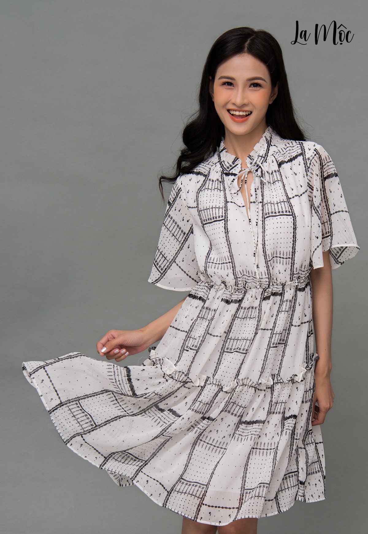 ✨Đầm Voan Xòe Cổ Trụ Nhún Eo Maxivic, La Mộc - LM72175