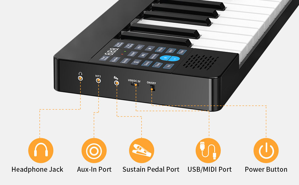 - Đàn có cổng USB và cáp đi kèm, hỗ trợ mạnh mẽ kết nối với các thiết bị khác như: Máy tính, Máy tính bảng, để làm nhạc, chơi nhạc điện tử EDM, thu