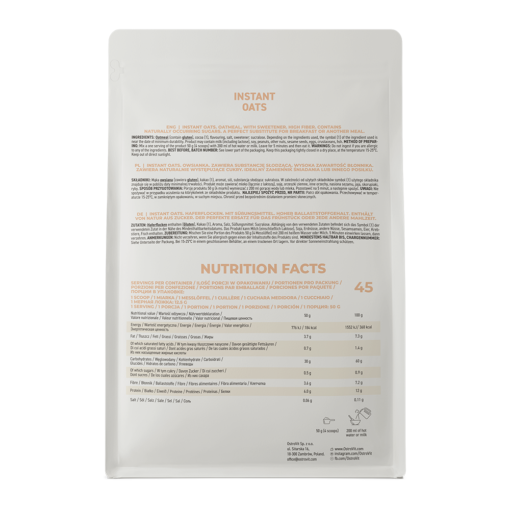 OstroVit Instant Oat Flakes là dòng bánh ngũ cốc dinh dưỡng, có sẵn trong hai hương vị thơm ngon: sô cô la và dâu, bạn có thể chuẩn bị trong vòng chỉ năm phút. Sản phẩm, nhờ vào thành phần của ngũ cốc, giàu chất xơ, beta-glucan và vitamin B1, nhờ đó sẽ mang lại cho bạn không chỉ một bữa ăn ngon mà còn rất có giá trị dinh dưỡng. Bạn đang tìm kiếm ý tưởng cho một bữa sáng dễ chuẩn bị mà sẽ no lâu và cung cấp năng lượng cho cả ngày? Hãy chọn OstroVit Instant Oat Flakes!