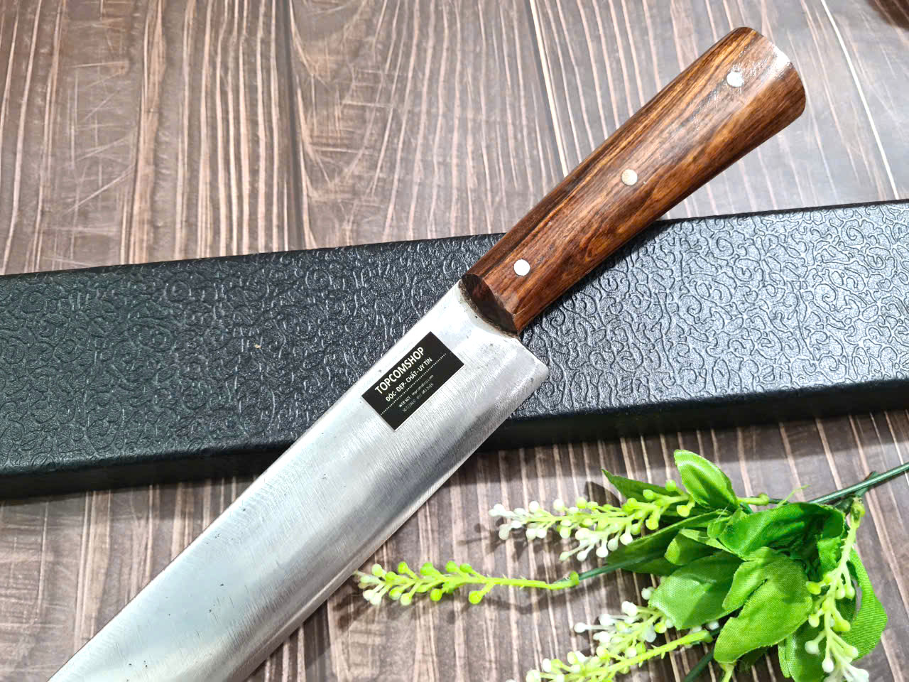- Chức năng: thái thịt, rau củ quả - Kích thước: Lưỡi: 17cm, cán: 12cm, rộng: 5cm, dầy: 1ly, trọng lượng: 200g - Cán : Gỗ cẩm chỉ, Chốt, Khâu ĐỒNG THAU , keo liên