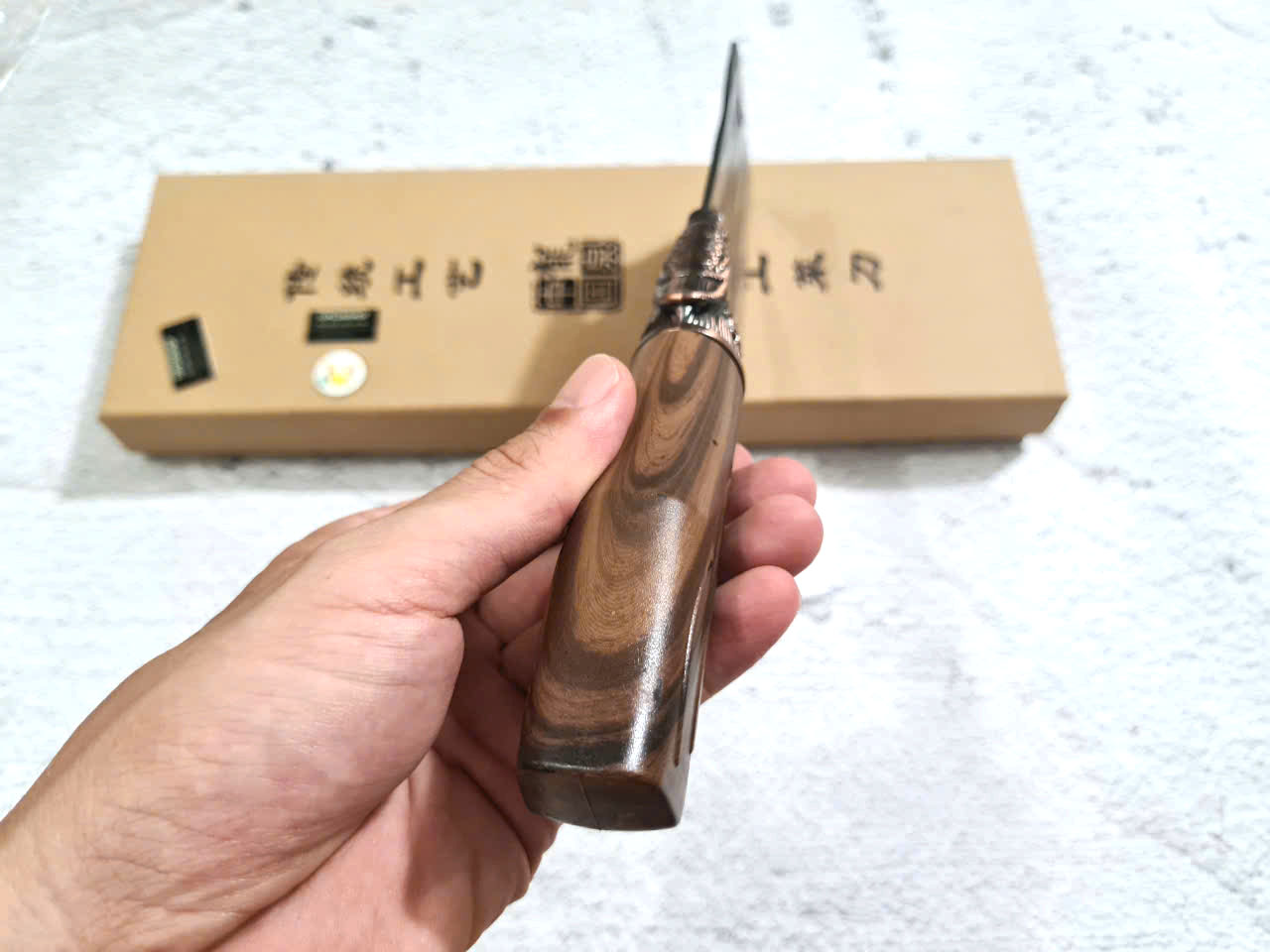 - Chức năng: chuyên chặt thái cá, chặt gà, lọ - Kích thước: Lưỡi: 26cm, cán: 12,5cm, rộng: 6,5cm, dầy: 4ly, trọng lượng: 480g - Cán : Gỗ mun , Khâu và chốt đồng đỏ