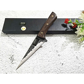 • Chất liệu: Thép Nhật 420J2, độ cứng 53HRC – siêu bền, chống gỉ • Lưỡi dao: Dày 2.5mm, sắc bén, hoàn thiện bằng đá mài nước • Tay cầm: Gỗ Pakka sang trọng, chống