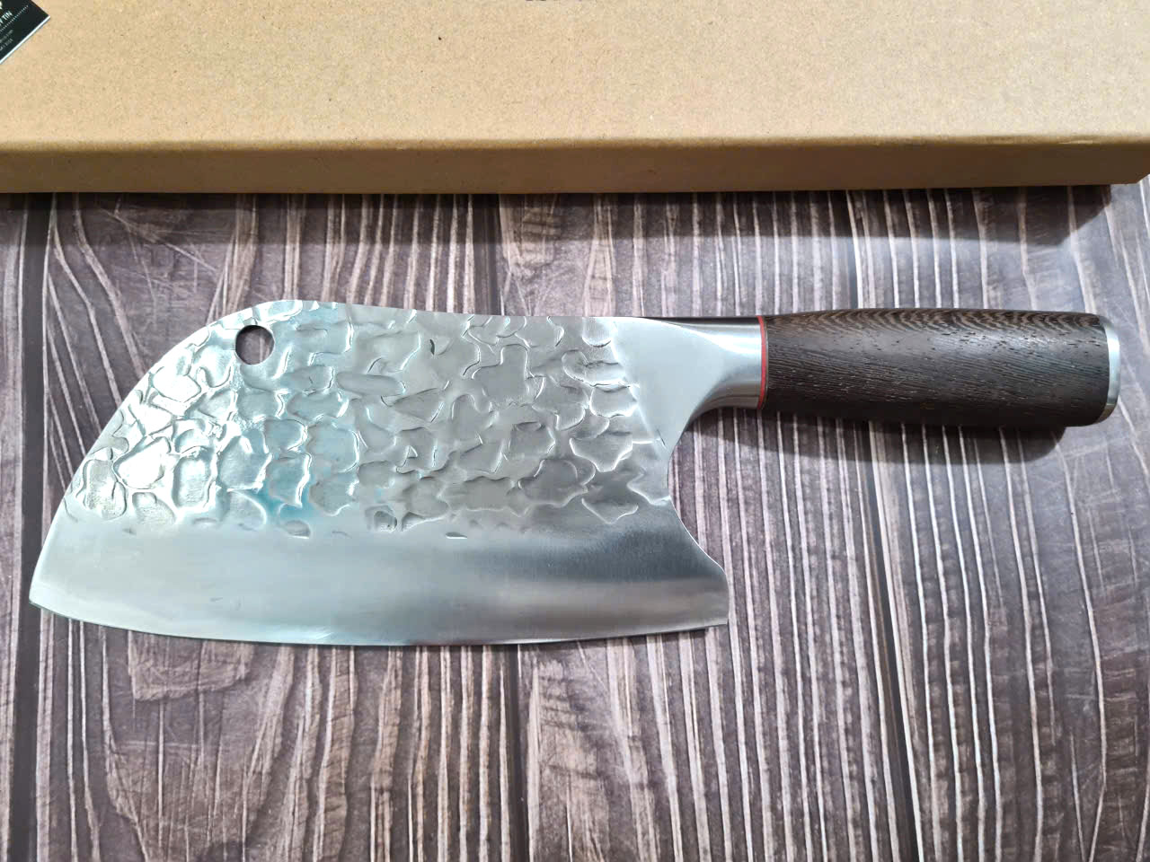 - Chức năng: Chặt xương ống, chân giò, trâu bò - Kích thước: Lưỡi: 22cm, cán: 10cm, rộng: 10cm, dầy: 5ly, trọng lượng: 800g - Cán : Gỗ mun, Khâu đồng đỏ , chốt đinh