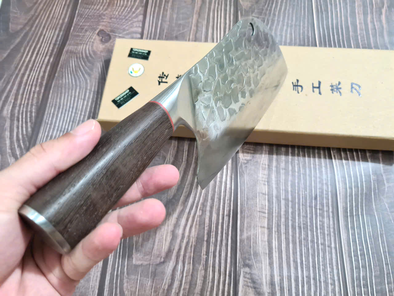 - Chức năng: chuyên chặt thái cá, chặt gà, lọ - Kích thước: Lưỡi: 26cm, cán: 12,5cm, rộng: 6,5cm, dầy: 4ly, trọng lượng: 480g - Cán : Gỗ mun , Khâu và chốt đồng đỏ