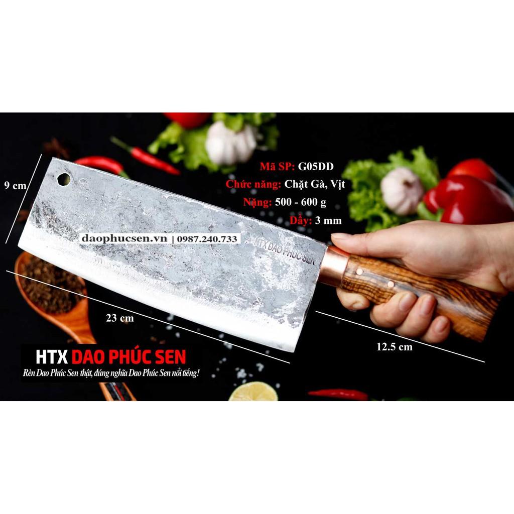 Dao Phúc Sen - Dao Chặt Gà Cán Cẩm Khâu Đồng G05D - Kích thước: lưỡi: 23cm, cán: 13cm, rộng: 8,5cm-9cm, dầy: 0,3, trọng lượng: 500g - 600g - Chức năng: sử dụng chuyên chặt