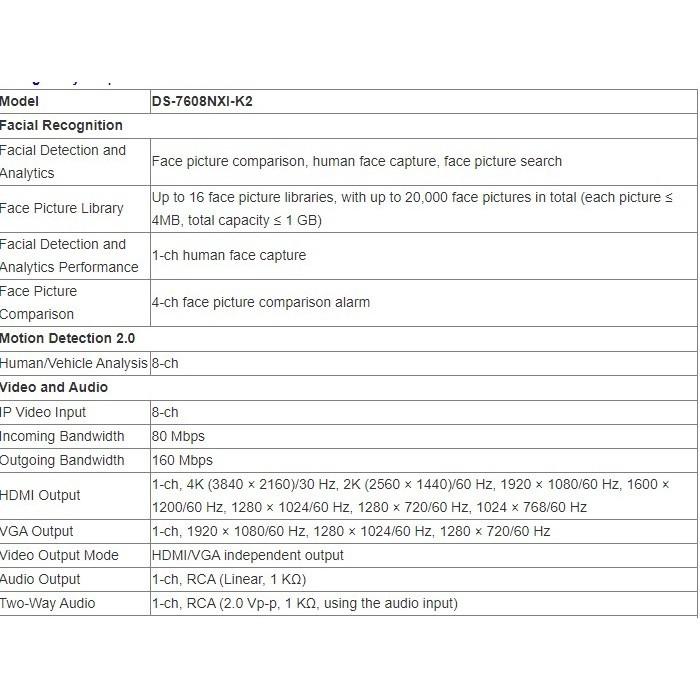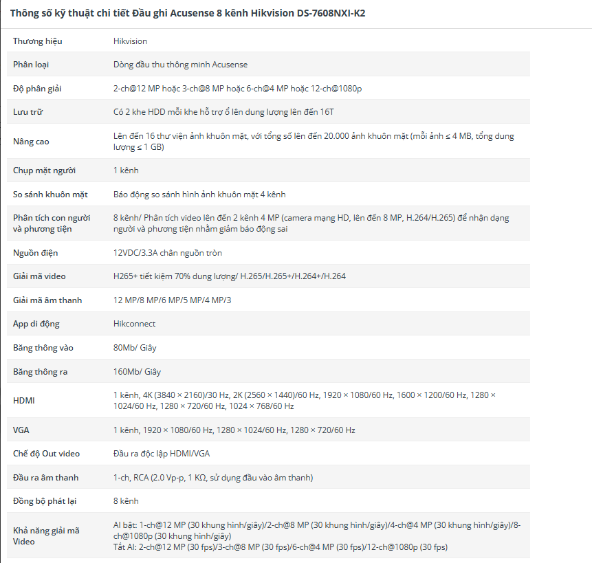 Thông số kỹ thuật đầu ghi hình IP 8 kênh AcuSense HIKVISION DS-7608NXI-K2 – Chuẩn nén H.265/H.265+/H.264/H.264+ – HDMI @1920 x 1080, VGA @1920 x 1080, 01 x RJ45 0/100/1000 Mbps, 02 x USB. –
