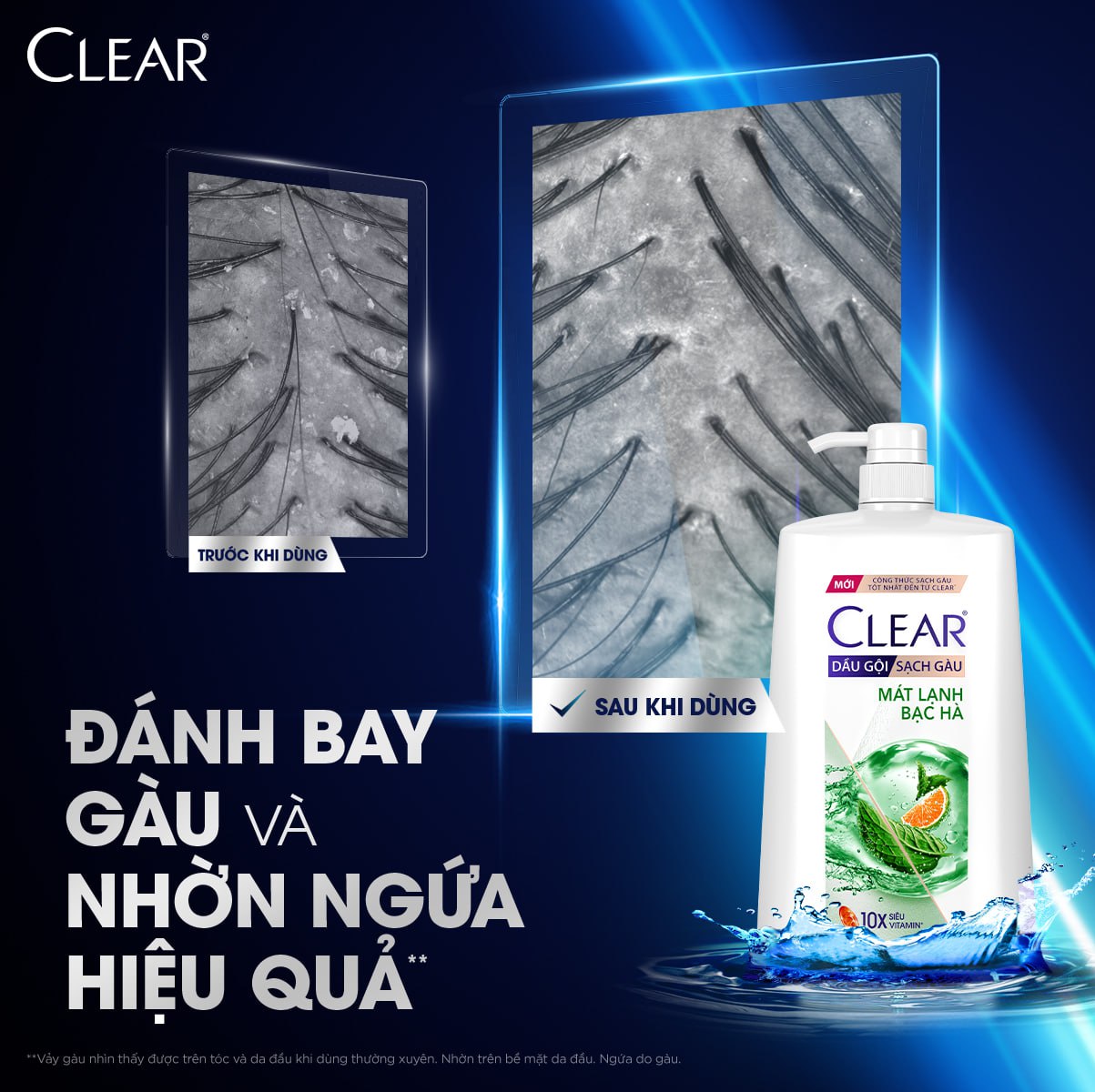 - Clear thế hệ mới với bọt siêu mịn, giúp loại bỏ tất cả vảy gàu trên da đầu, giúp bạn tự tin, không còn lo vảy gàu xuất hiện trên tóc & vai áo