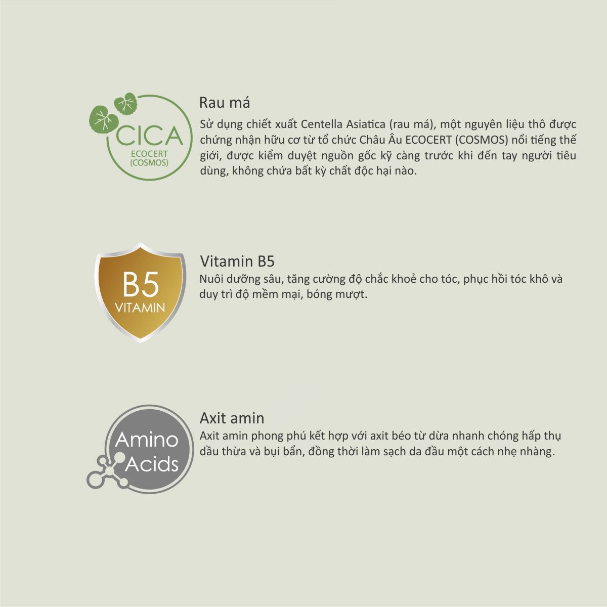 - Axit amin: Axit amin phong phú kết hợp với axit béo từ dừa nhanh chóng hấp thụ dầu thừa và bụi bẩn, đồng thời làm sạch da đầu một cách nhẹ nhàng. • Chiết xuất tinh chất từ rau má CICA được trồng trên những vùng đất sạch, an toàn tuyệt đối.