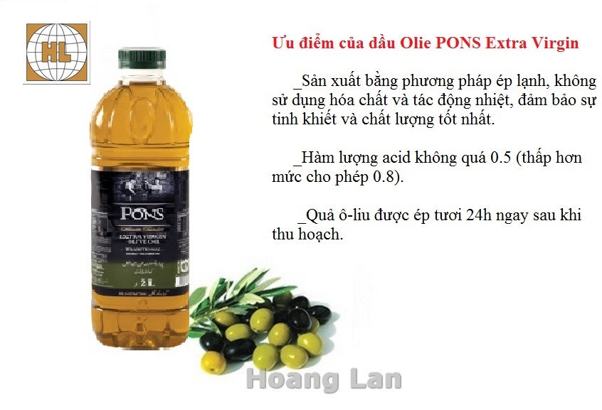 - Dầu Olive Extra Virgin PONS 1 lít - Tây Ban Nha (Chai nhựa) - _Thời hạn sử dụng: 30 tháng kể từ ngày sản xuất - _NSX, HSD: Xem trên bao bì. - _Thể tích thực: 1L ( Chai nhựa ) - _Xuất xứ: Euroaliment P.A.C., S.L.U (Tây Ban Nha) -   - Đây là một loại chất béo được chiết xuất từ loại quả của cây Olive hay có tên quốc tế là Olea Europaea. Loại cây này là đặc sản mang tên tuổi của vùng đất Địa Trung Hải. Dầu Olive được sử dụng rộng rãi trong cuộc sống. Tuy nhiên được ưu tiên và chú trọng trong lĩnh vực mỹ phẩm, nấu ăn và dược liệu.  -   - _ Dầu Olive Extra Virgin PONS 250ml - Tây Ban Nha được sản xuất theo phương pháp ép lạnh, không đòi hỏi sử dụng hóa chất hay tác động nhiệt vào quy trình, giúp dầu giữ lại được các chất dinh dưỡng và có độ tinh khiết cao nhất. Vì vậy mà dầu Olive ép lạnh được nghiên cứu là mang lại nhiều lợi ích về sức khỏe hơn dầu Olive thông thường.  -   - _ Phần lớn chất béo chứa trong dầu Olive Pons Extra Virgin đều là chất béo không bão hòa rất tốt cho sức khỏe. Tiêu thụ chất béo không bão hòa giúp giảm khả năng mắc các bệnh tiểu đường loại 2, tim, ung thư và bệnh mãn tính. Dầu Olive ép lạnh cũng chứa ít nhất 30 hợp chất thực vật có lợi, nhiều chất chống oxy hóa mạnh có tác dụng chống viêm, hạ huyết áp, ngăn chặn sự phát triển của một số loại ung thư. Dầu Olive hoàn toàn có thể thay thế dầu ăn thông thường và là thực phẩm bổ sung lành mạnh.  -   - _Dầu có hàm lượng acid không quá 0.5o -   - _Hương vị thơm ngon đậm đà hơn nhờ quả ô-liu được ép tươi ngay sau khi thu hoạch -   - _Thành phần: Dầu Olive nguyên chất 100% được sản xuất theo phương pháp ép lạnh quả tươi ngay sau khi thu hoạch. -