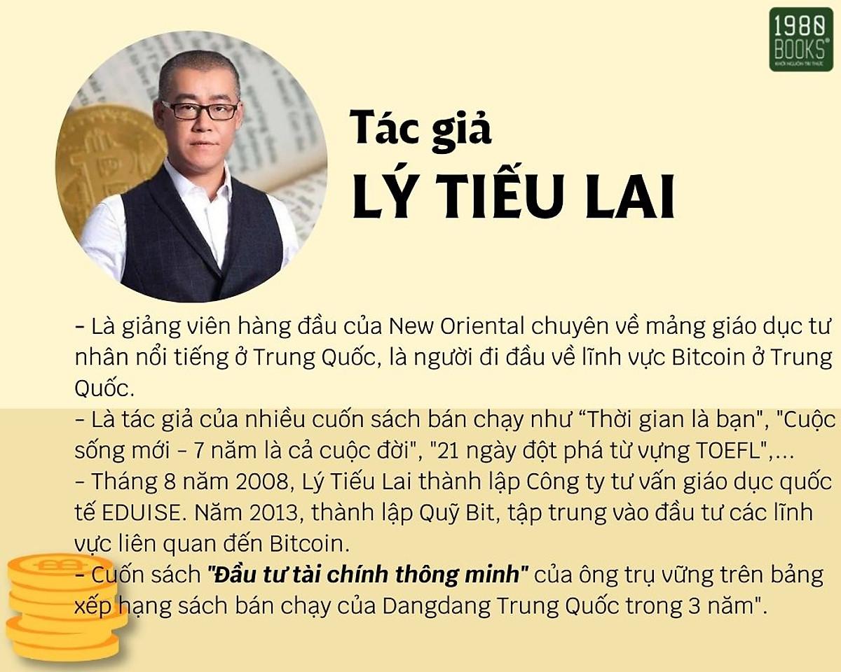 • Thông tin tác giả: Lý Tiếu Lai là giảng viên hàng đầu của New O chuyên về mảng giáo dục tư nhân nổi tiếng ở Trung Quốc, là người đi đầu về lĩnh vực bit coin ở Trung Quốc. Hiện ông là tác giả của nhiều cuốn sách bán chạy như “Thời gian là bạn", "Cuộc sống mới - 7 năm là cả cuộc đời", "21 ngày đột phá từ vựng TOEFL", Tháng 8 năm 2008, Lý Tiếu Lai thành lập Công ty tư vấn giáo dục quốc tế EDUISE. Năm 2013, thành lập Quỹ Bit, tập trung vào đầu tư các lĩnh vực liên quan đến bit coin. Tác giả 170.000 lượt theo dõi có thu phí trên chuyên trang cá nhân. "Cuốn đầu tư tài chính thông minh” của ông trụ vững trên bảng xếp hạng sách bán chạy của Dangdang Trung Quốc trong 3 năm"