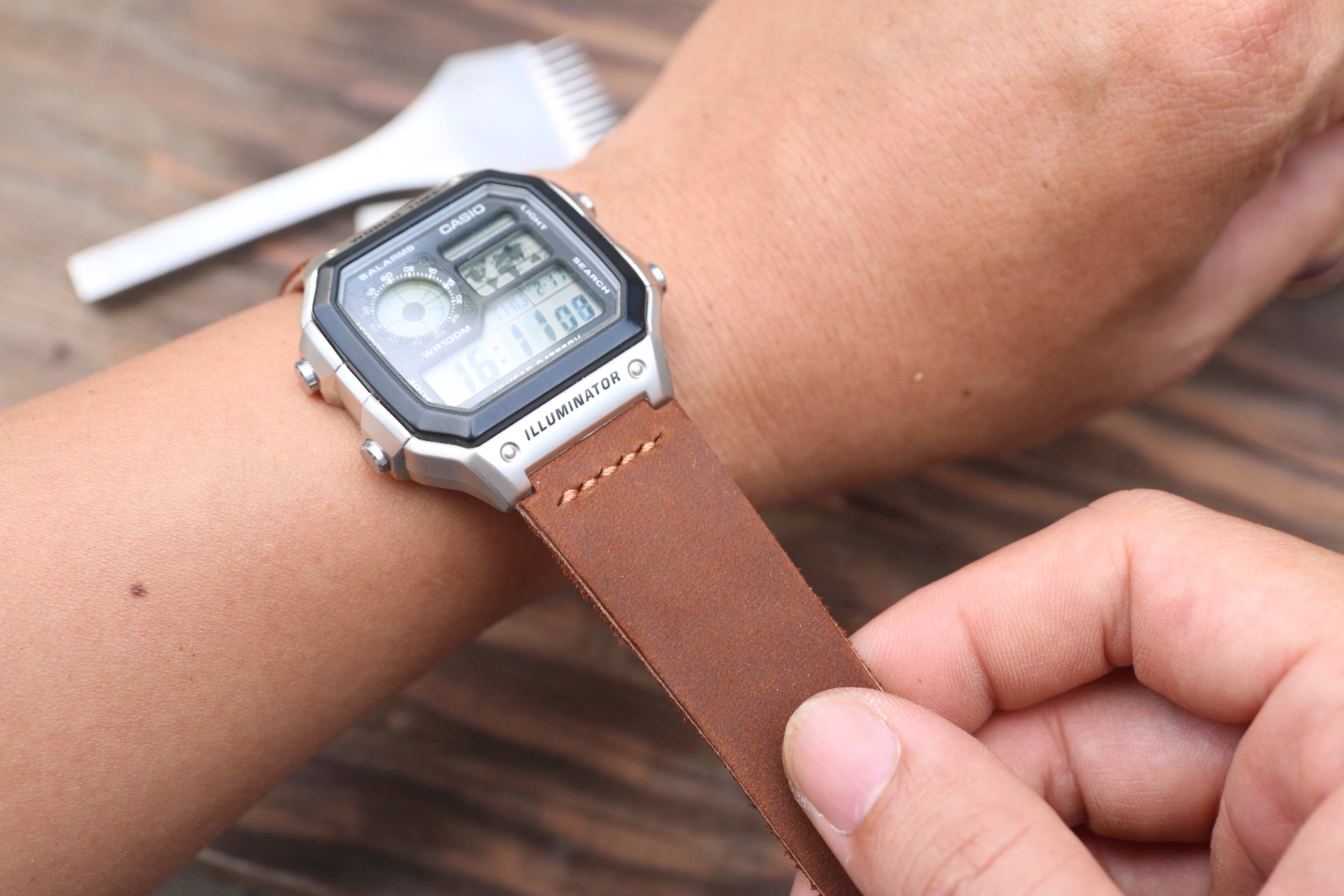 ✨Dây Da Thật Thay Thế Dành Cho Đồng Hồ Casio AE1200 Da Sáp Nâu Sậm Handmade