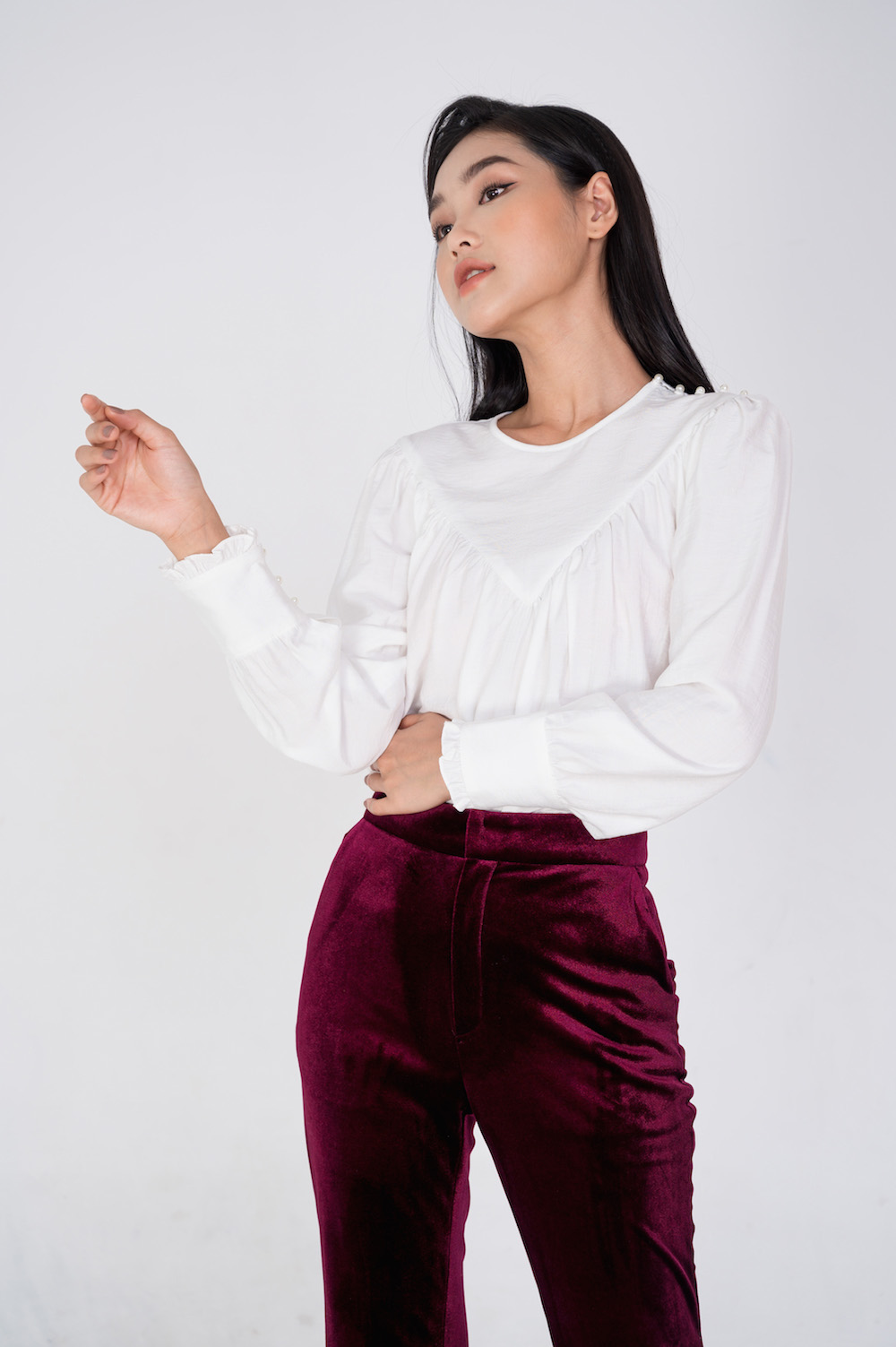 Áo dáng suông, với phần cổ cách điệu được nhún li ngực tạo phom suông rộng trẻ trung. Áo với điểm nhấn là hàng khuy trai 1 bên vài và tay bo kẹp bèo nhí