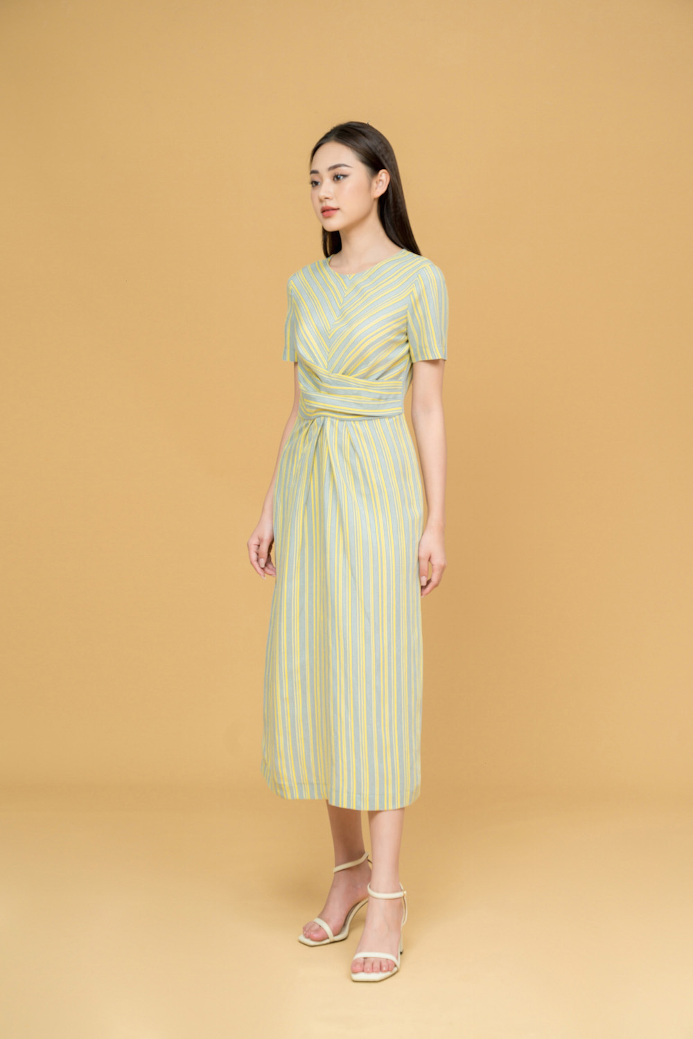 Đầm suông midi dáng dài, với vạt xoắn eo trẻ trung, cách điệu được cắt đối kẻ khéo léo, tinh tế. Chất liệu vải thô in hoạ tiết Hàn Quốc, mềm, mát. Tông mầu vàng