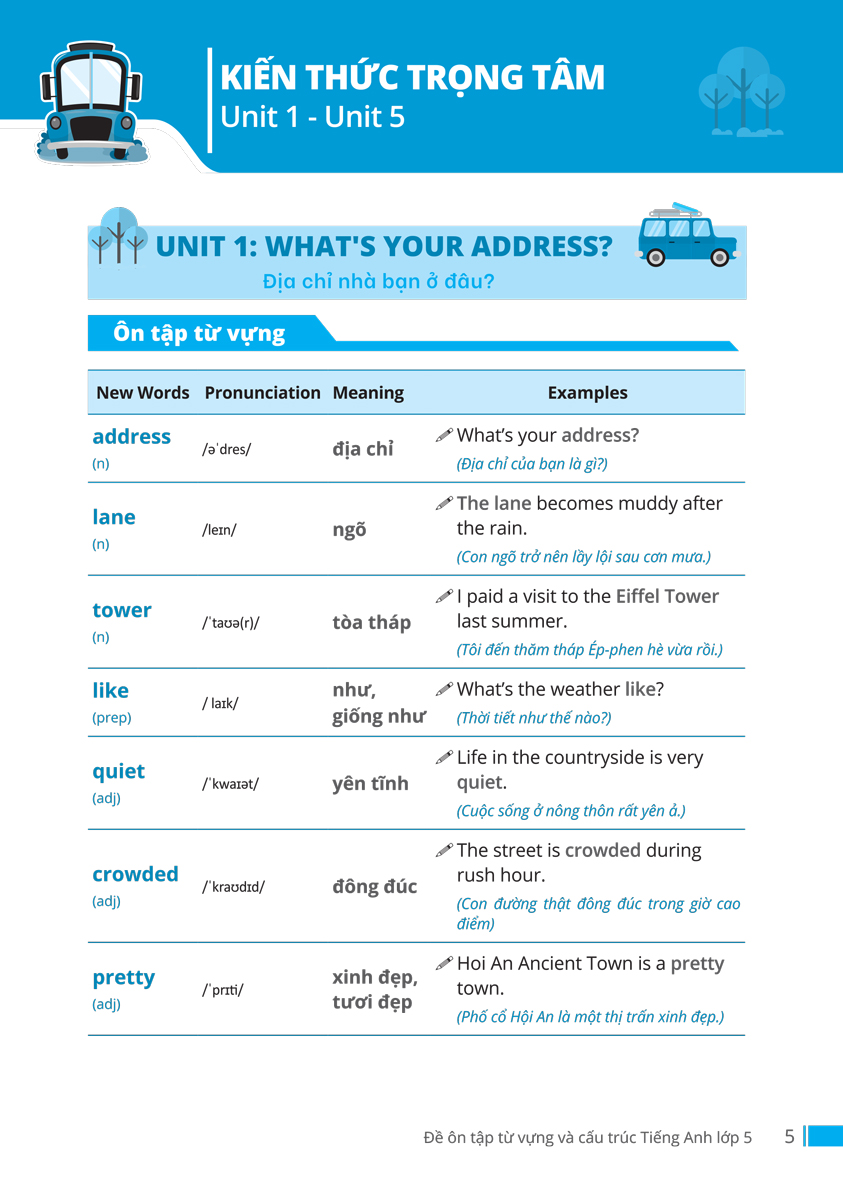 ÔN TẬP CẤU TRÚC: Giới thiệu những mẫu câu theo chủ đề bài học kèm ví dụ cụ thể để các em dễ dàng ghi nhớ và vận dụng đúng ngữ pháp.