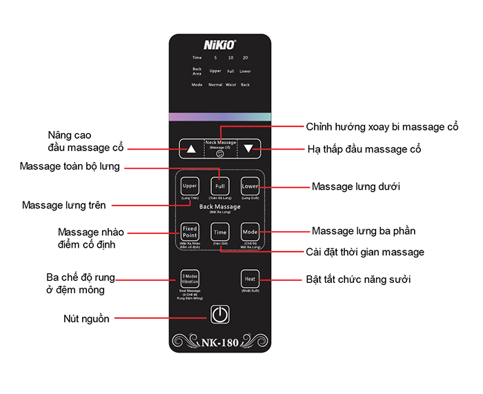 Nút neck massage: Kích hoạt chế độ massage và tùy chỉnh hướng xoay của động cơ massage cổ. Có 2 hướng Thuận – Nghịch cho bạn lựa chọn.