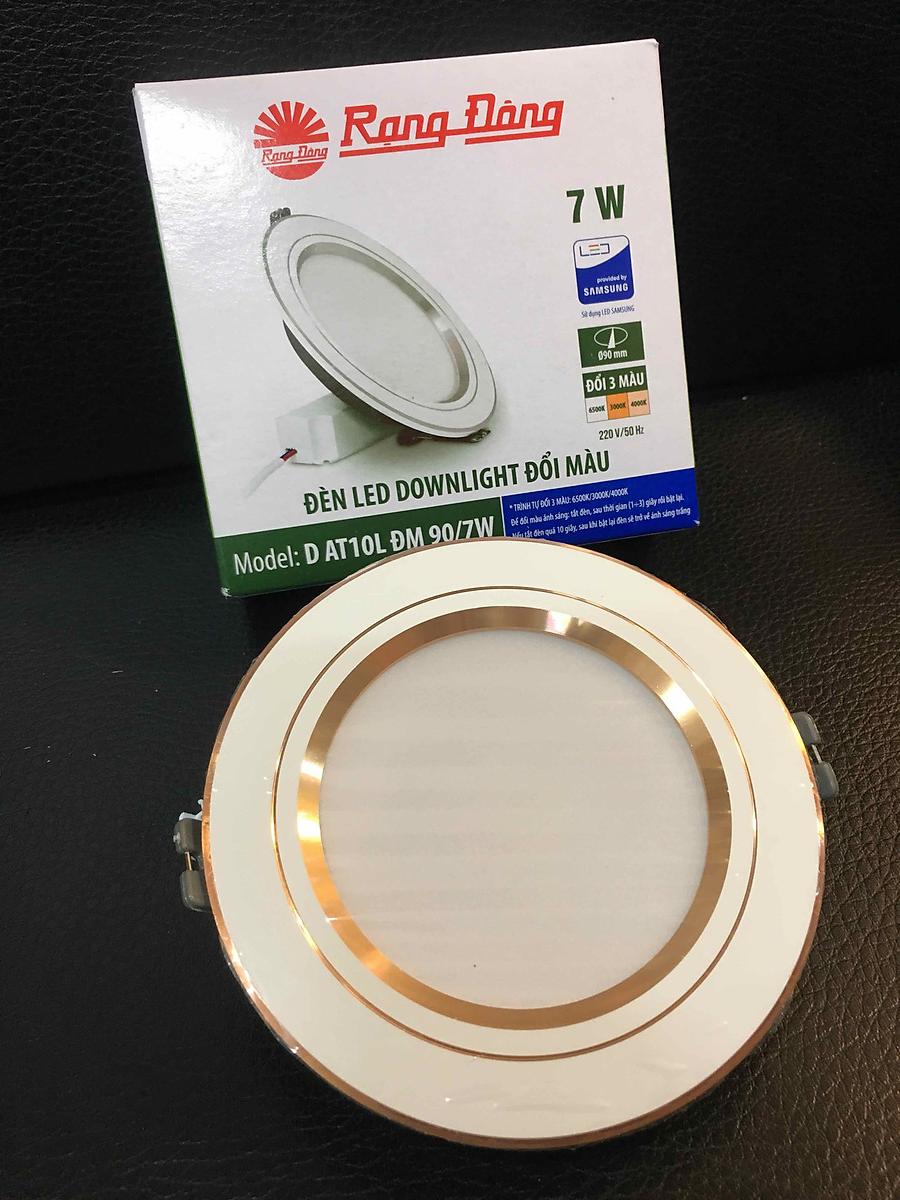 Shop thương hiệu Rạng Đông uy tín, tin cậy Model: AT10L ĐM 90/7W - Viền mạ vàng Dải điện áp hoạt động: (150 - 220VAC)/50Hz Quang thông: Sáng trắng 550lm /Sáng vàng 470lm/ Sáng trung