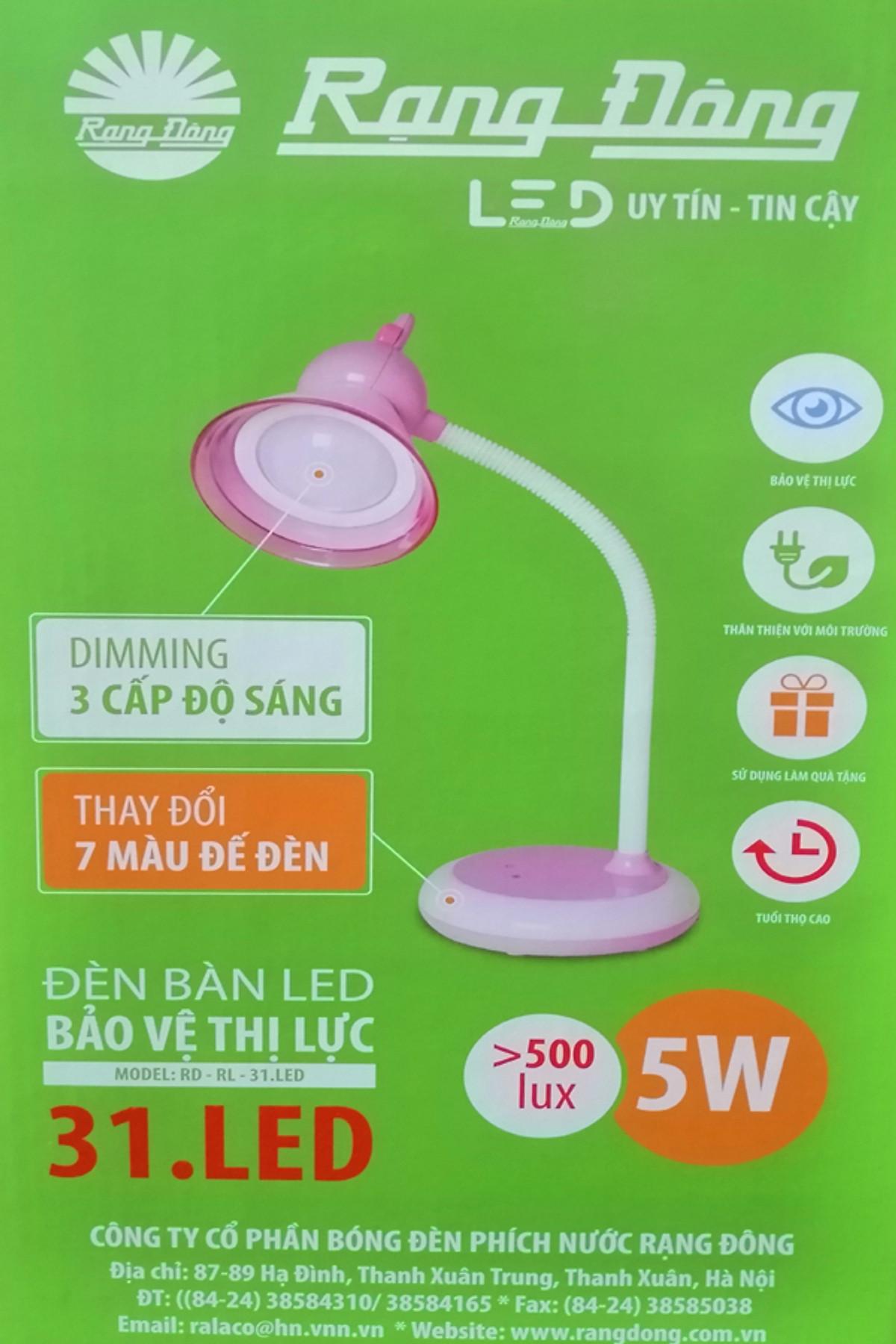 Model: Công suất: 6W Điện áp danh định: 220V/50Hz Độ rọi trung bình: 700 lux Hệ số trả màu: 80 Đèn bàn LED Rạng Đông bảo vệ thị lực Thiết kế sang trọng, màu sắc