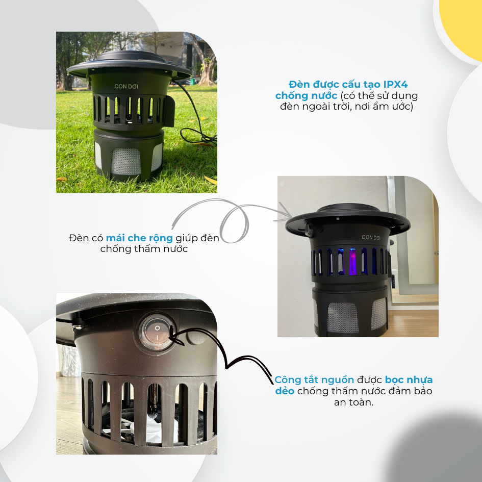 - Đèn bắt muỗi Con Dơi thu hút muỗi bằng ánh sáng UVA chuyên dụng và bẩy muỗi bằng quạt hút.