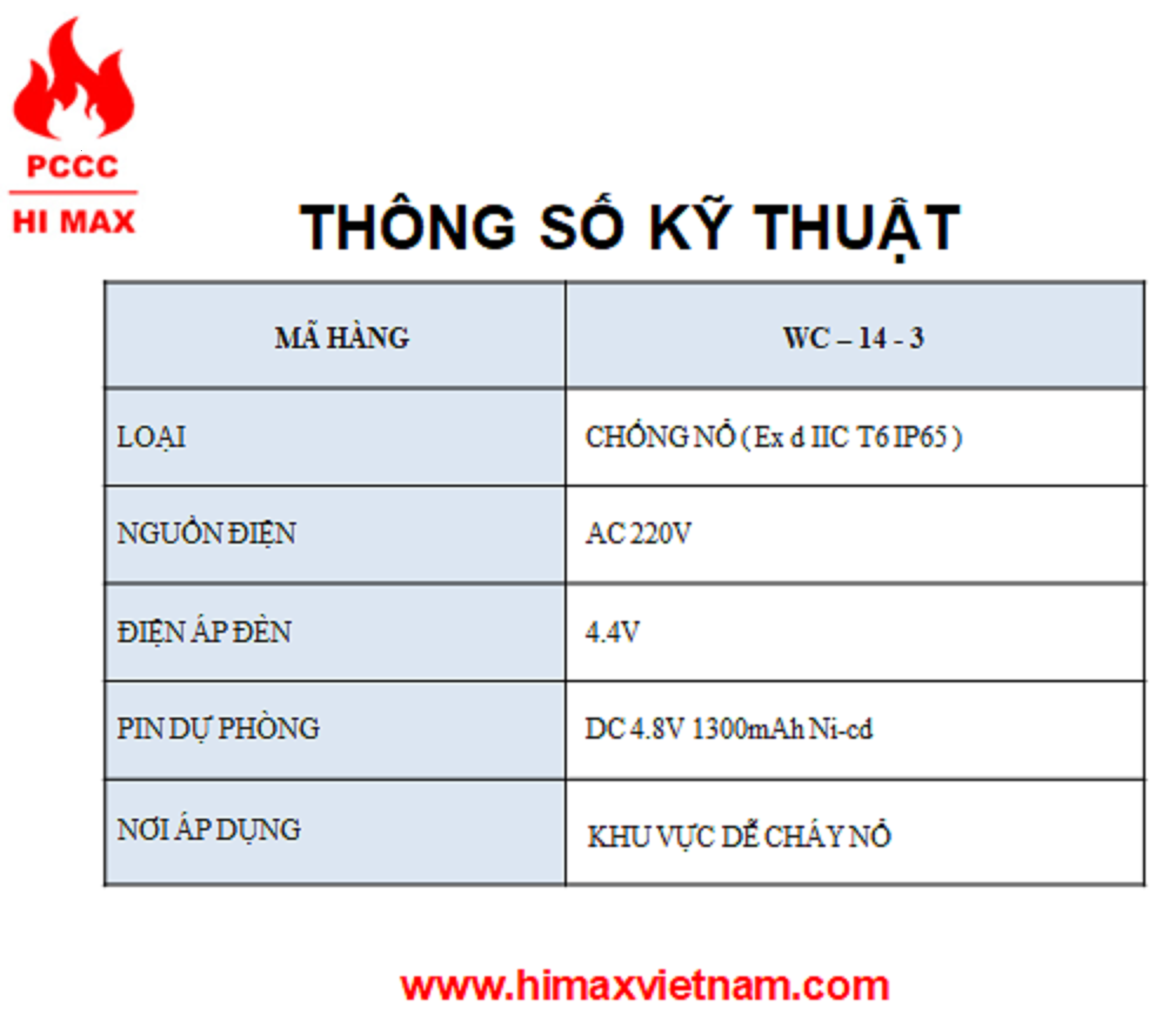 MÃ HÀNG: WC-14-3 LOẠI: CHỐNG NỔ ( Ex d IIC T6 IP65 ) NGUỒN ĐIỆN: AC 220V ĐIỆN ÁP ĐÈN: 4.4V PIN DỰ PHÒNG: DC 4.8V, 1300mAh Ni-Cd NƠI ÁP DỤNG: KHU VỰC DỄ CHÁY NỔ #himax #pccc #baochay #hanquoc #vietnam #kiemdinh #hethongpccc #himaxvietnam #hethongbaochay #antoanchongno #baochayhimax #korea #thietbibaochay #baochaytudong #antoanchayno #WC-14-3 #denkhancap #denchieusangkhancap #denkhancapchongno #denchieusangkhancapchongno #chongno #explosionproof #himax