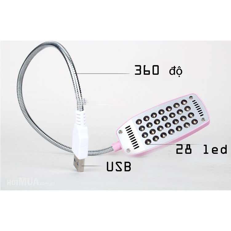 - Đèn Led 28 bóng cắm cổng USB có thiết kế đơn giản từ 28 đèn LED đảm bảo đủ ánh sáng cho mọi hoạt động của bạn như đọc sách, làm việc với bàn phím, hay thậm chí là học bài. Phần thân của thiết bị này được làm từ kim loại nhỏ gọn có thể uốn cong theo ý thích, đặc biệt là đầu USB tiện dụng có thể lấy năng lượng từ PC hoặc laptop.