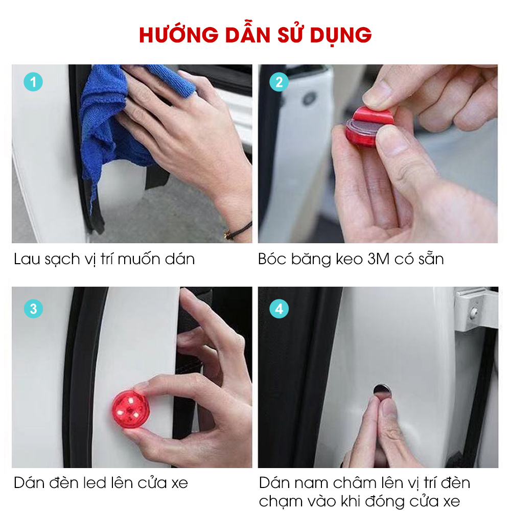 Băng dính có độ dính cao, chắc chắn, không lo đèn bị bong ra sau khi dán. Không cần khoan, không cần đi dây, chỉ cần dán đèn cảnh báo mở cửa ô tô lên cửa xe. Kích thước nhỏ gọn, không bị cộm khi đóng cửa xe. Đèn cảnh báo mở cửa xe sử dụng pin tròn phổ biến, dễ thay pin khi hết pin.